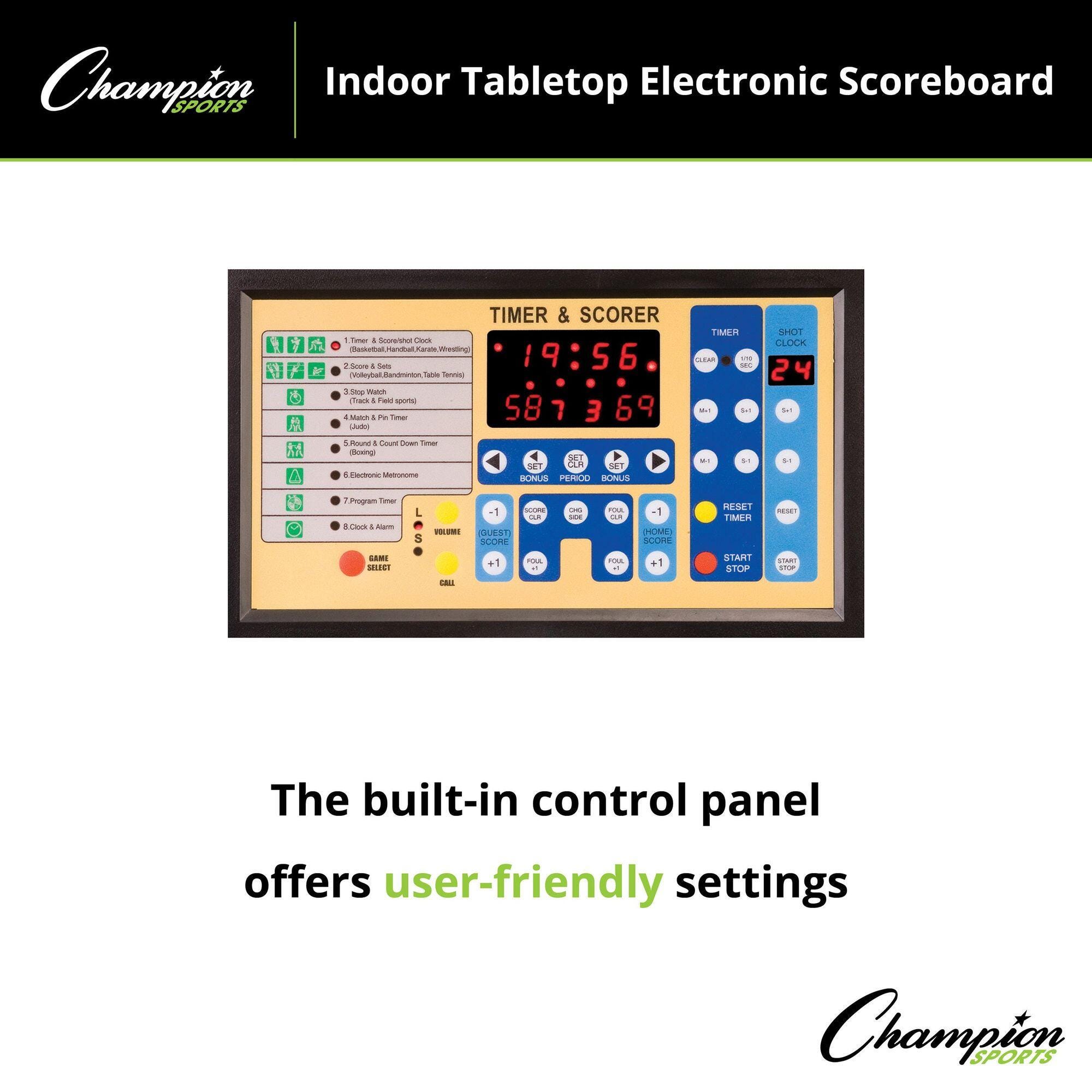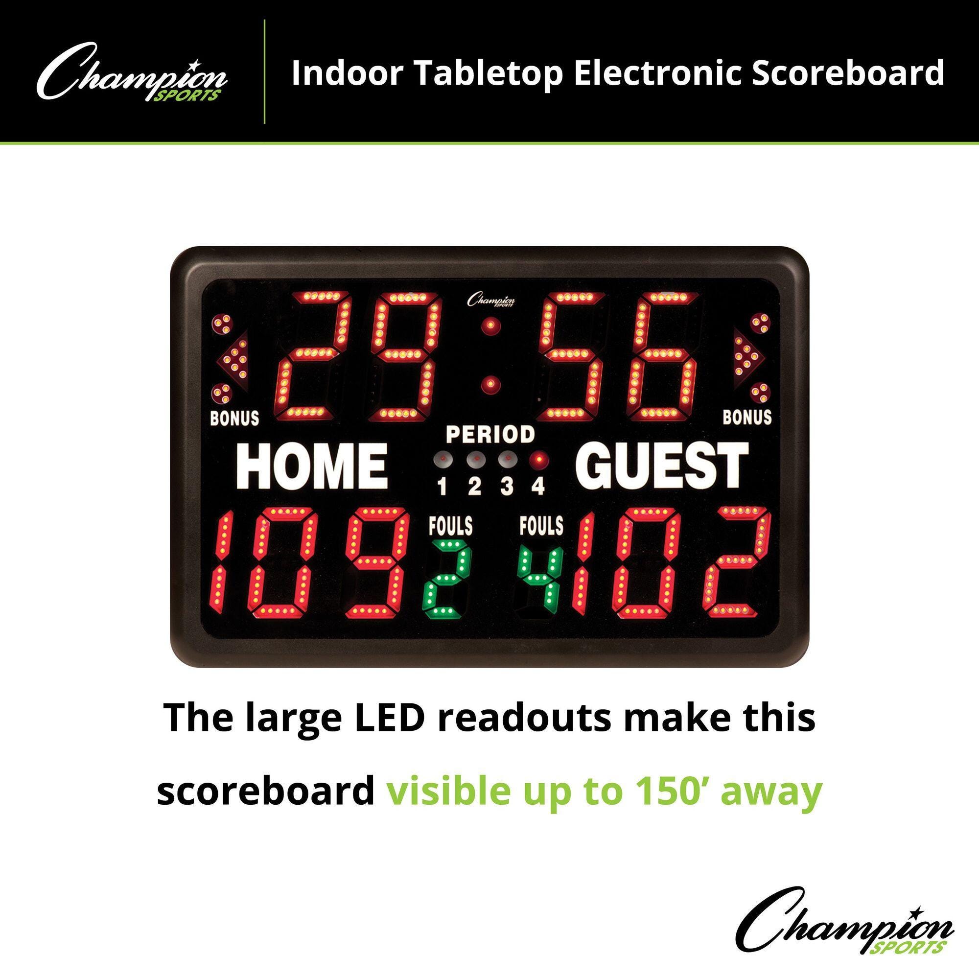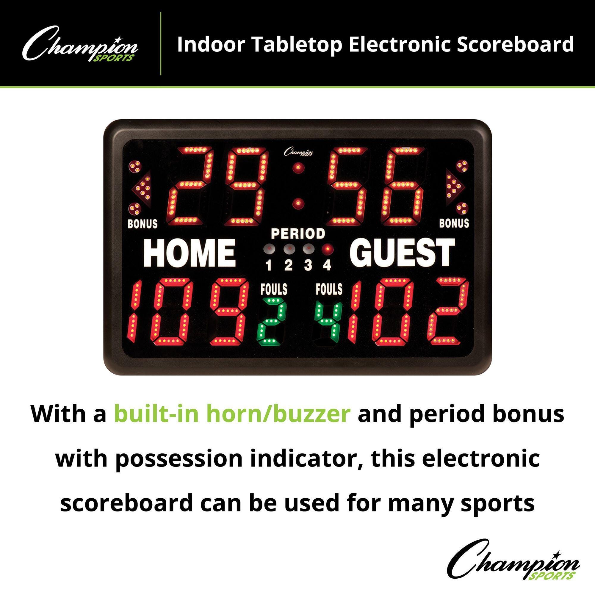 Champion Sports Table-Top Scorer/Timer measuring 22 x 15 x 8 inches, is designed for indoor use and includes possession arrows, front panel horn, count-up/count-down mode selector, period/bonus indicator and a long electrical cord. This light-weight unit is versatile, dependable as well as portable and can easily accommodate the timing and scoring needs of various indoor sports. Unit features a convenient rear control panel that is graphical, logical, easy-to-understand and easy-to-use. LED screen displays 2 x 4 inch sized letters and it has a rear display LED window, which allows the operator to view the same readout as on front scoreboard.