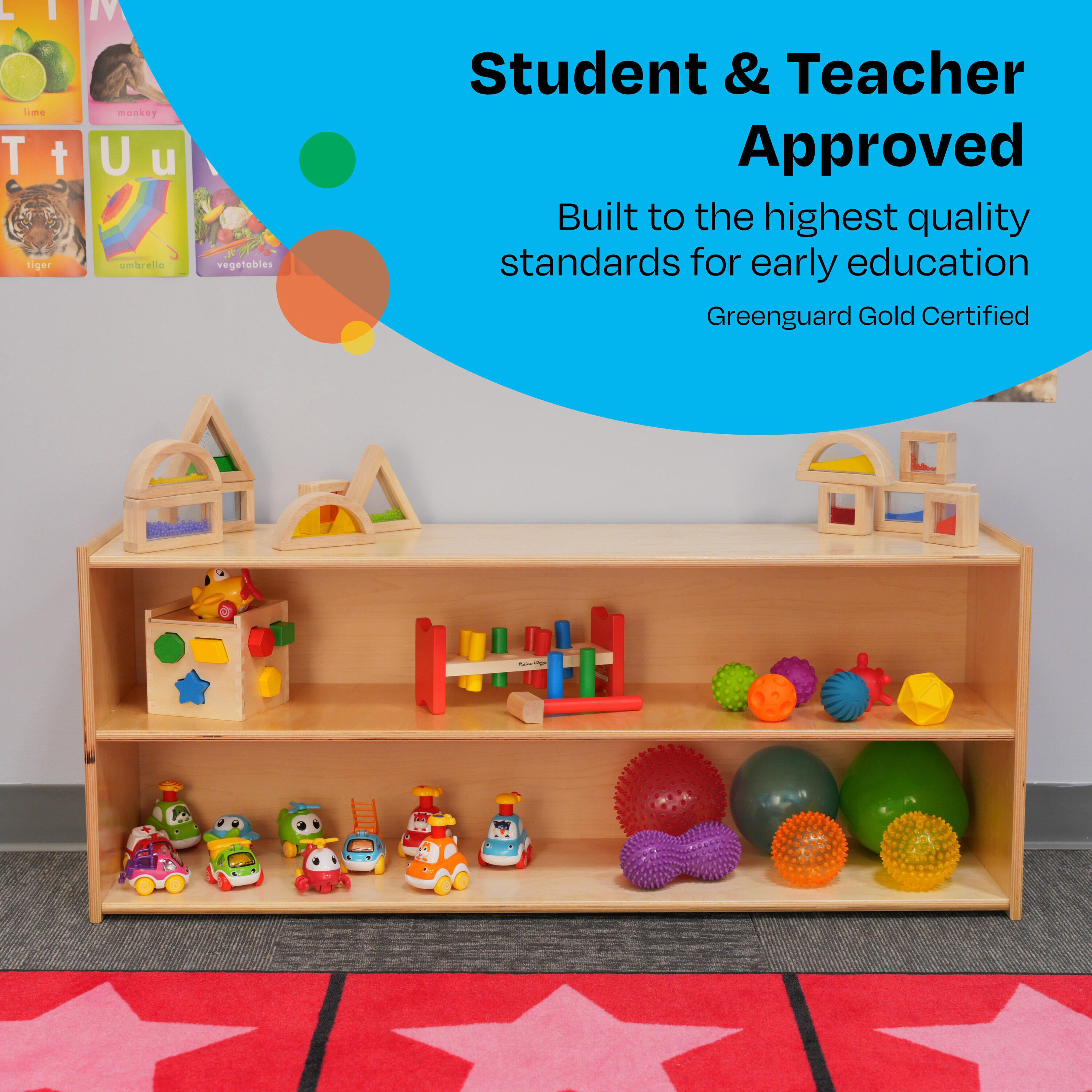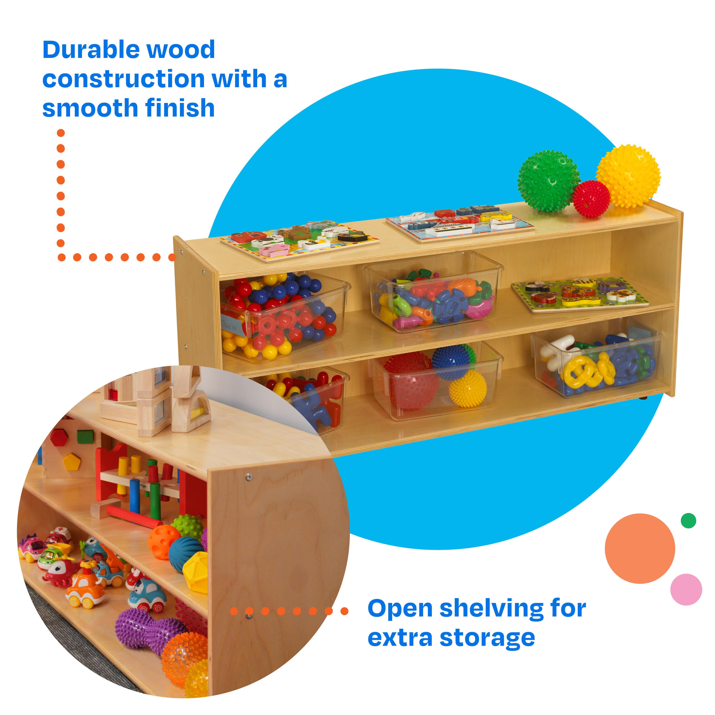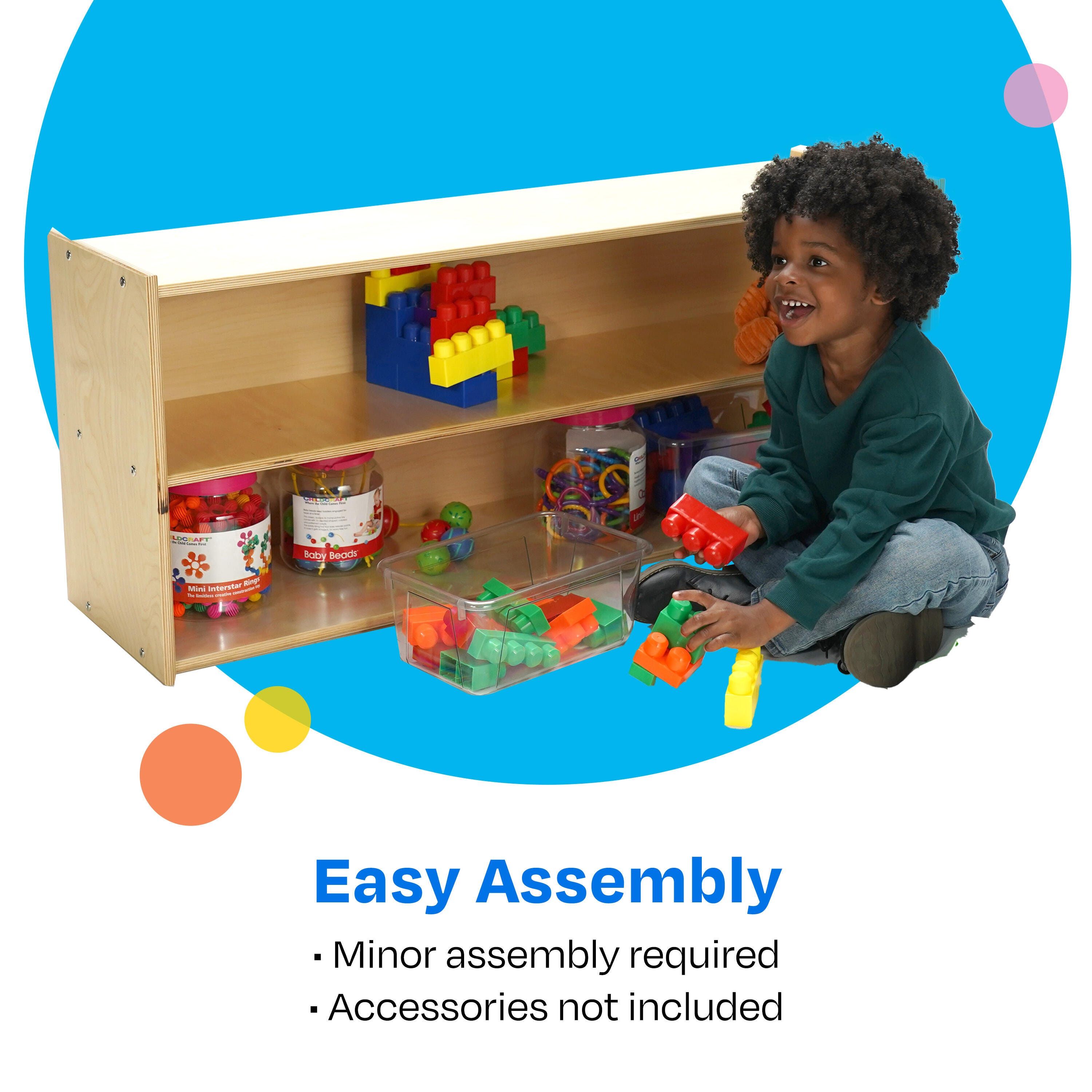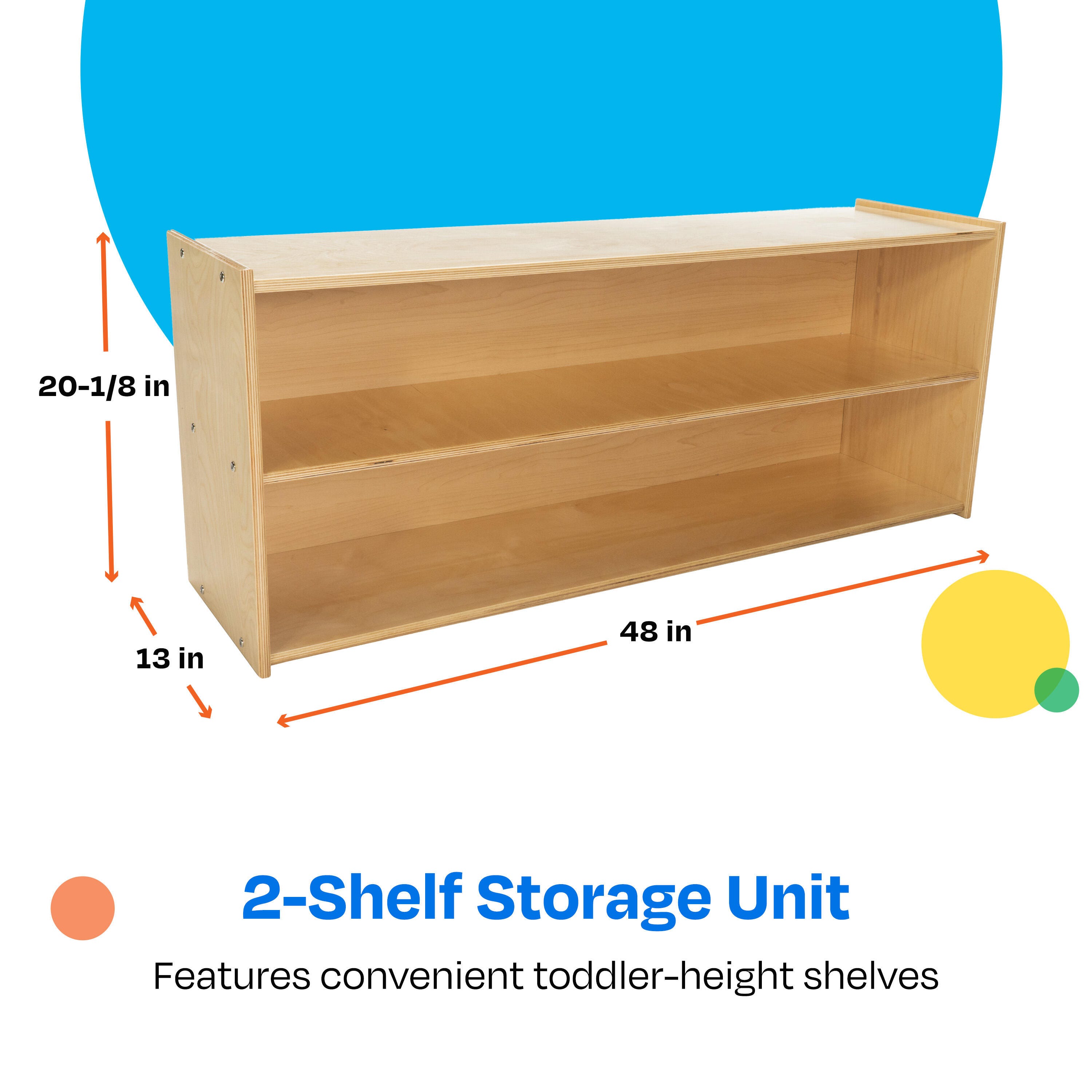 Childcraft® 2-Shelf Storage Unit for Classrooms is easy to assemble and made with a durable design. Use the toddler-height wooden shelves for preschool, kindergarten, daycare centers, homes, and beyond. A shorter design is the ideal height for young children. The storage shelves are great for storing and organizing games, books, manipulatives, and toys. Crafted for long-lasting use, this classroom furniture piece is made of durable birch plywood that’s easy to wipe clean. Assembly is required. This item comes with a limited lifetime warranty.