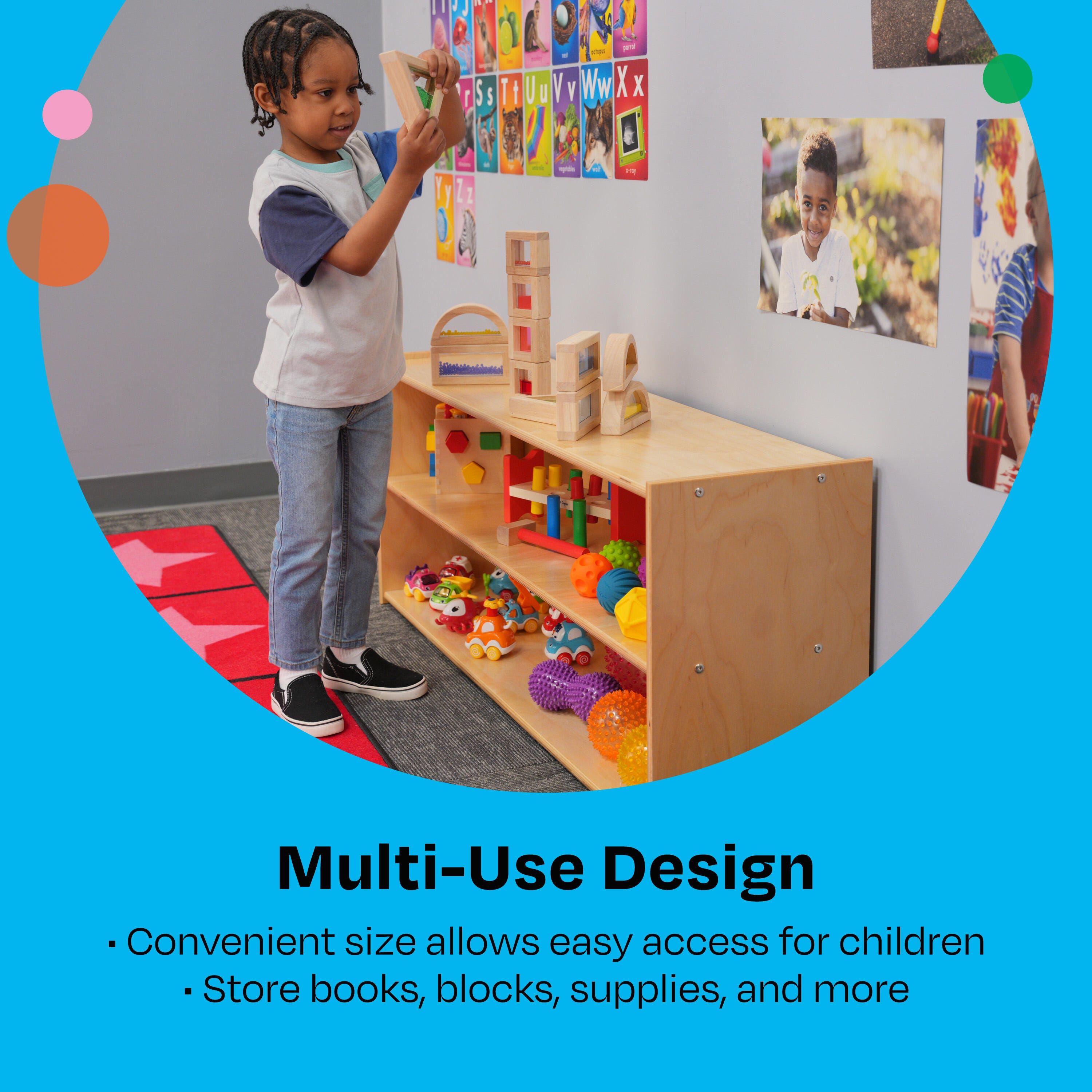A low height and wide design helps young children easily reach shelves