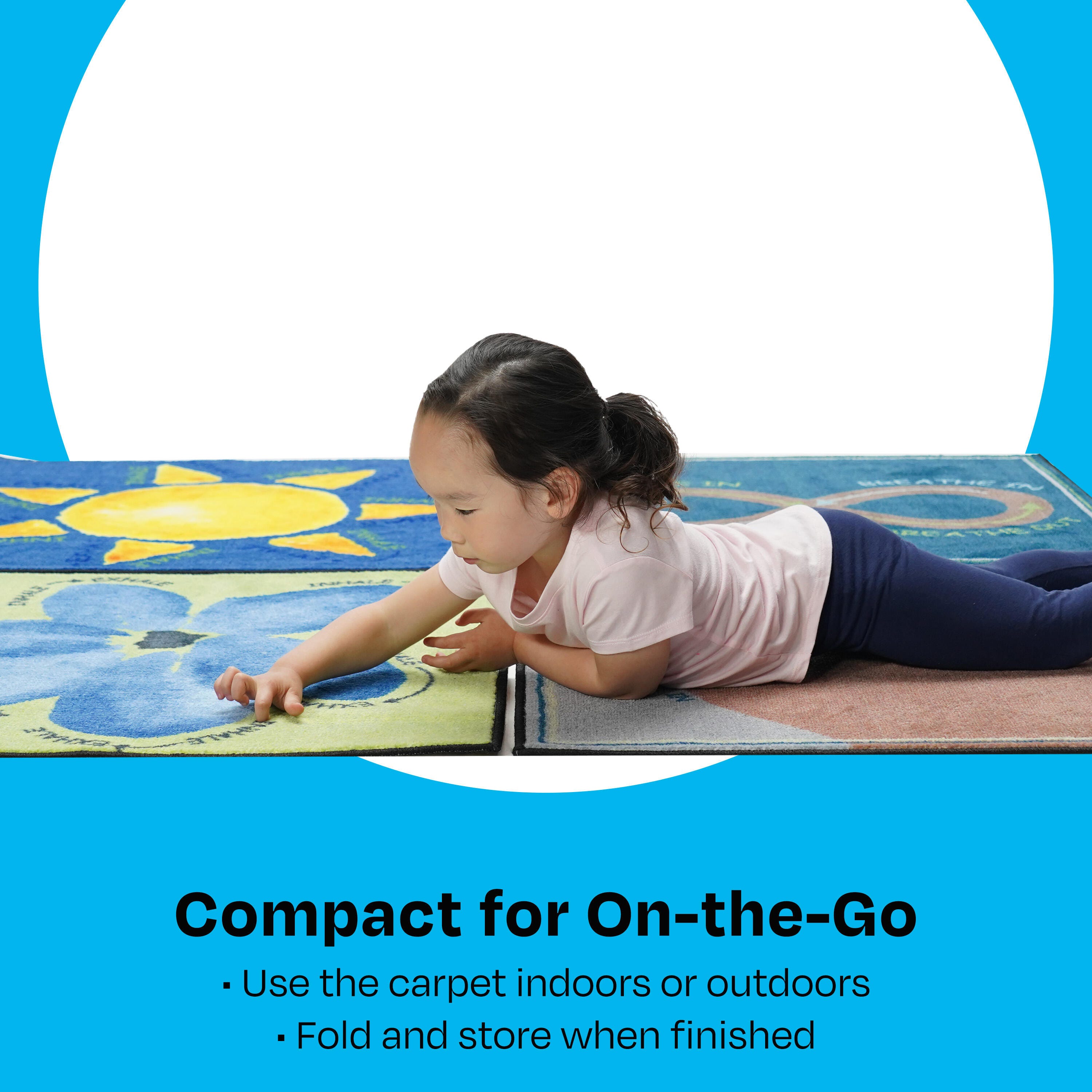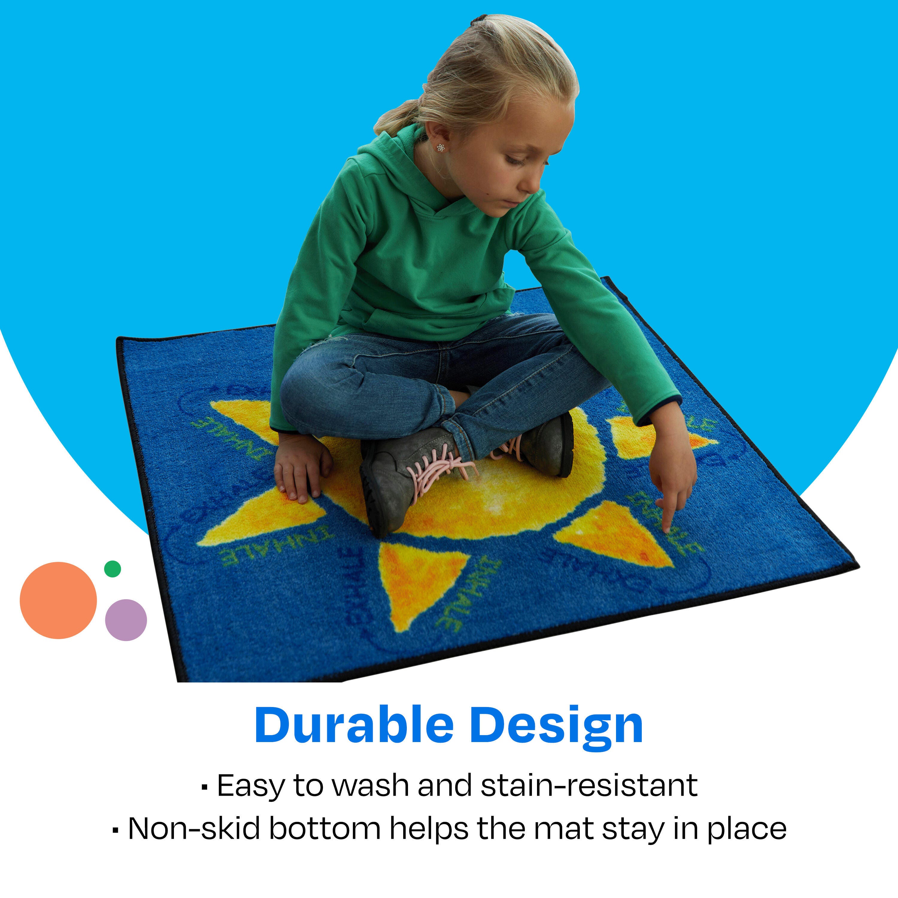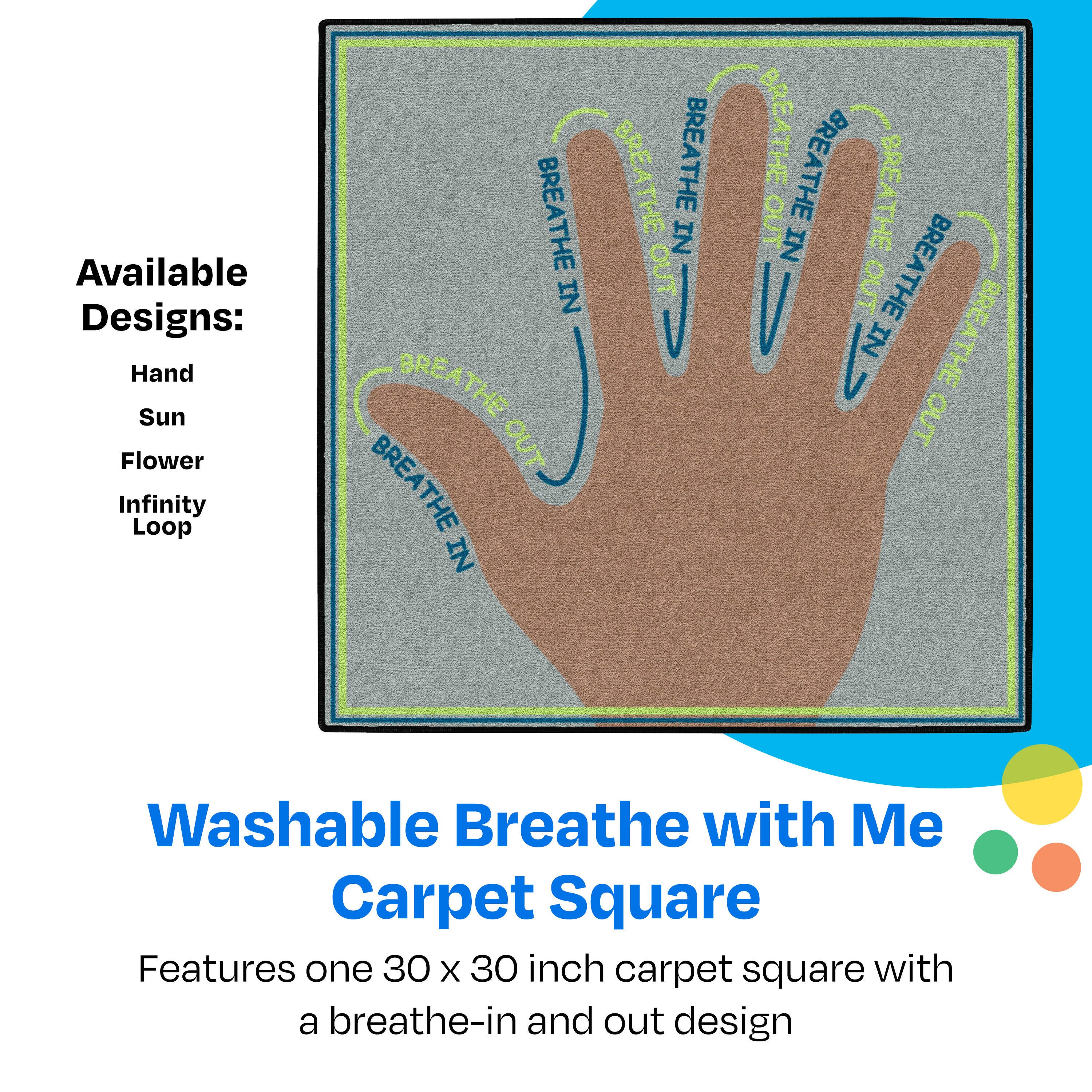 These carpet squares make a perfect addition to any classroom's calming area or safe space! The Childcraft ABC Furnishings Breathe With Me washable, skid-resistant floor mat can help support the development of important executive functions and social and emotional skills. Each learning carpet is designed with visual cues to guide little learners to soothe themselves by taking deep breaths in and out, a technique proven to help balance emotions and lower stress. Students can also physically trace each design on this classroom carpet staple as they breathe for a more tactile and engaging experience. The edges are tightly bound and double-stitched for maximum strength, and the play rug squares fold easily for storage. Wash with cold water and liquid detergent on a gentle cycle for best results, then air-dry. Do not bleach. Each educational rug is sold individually.
