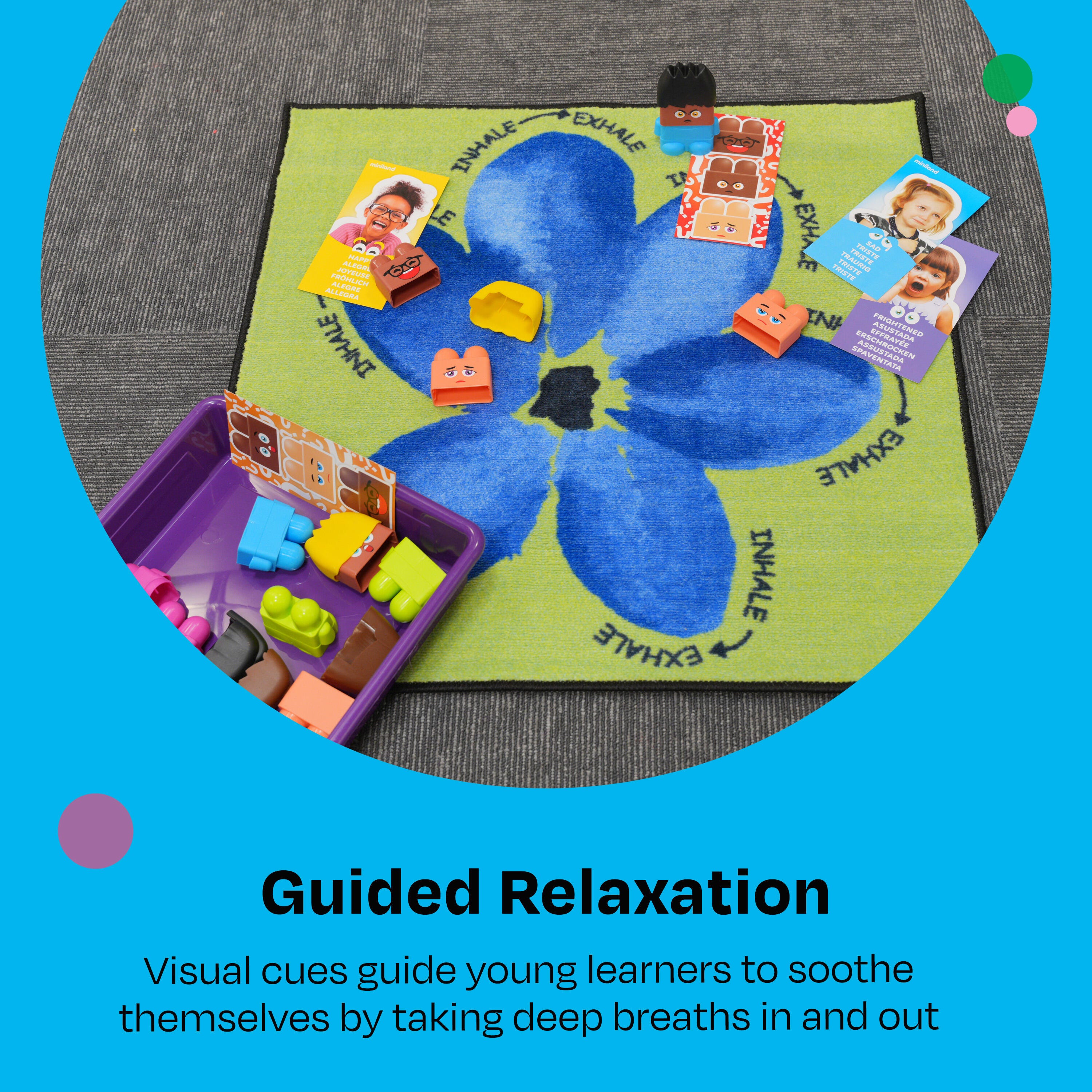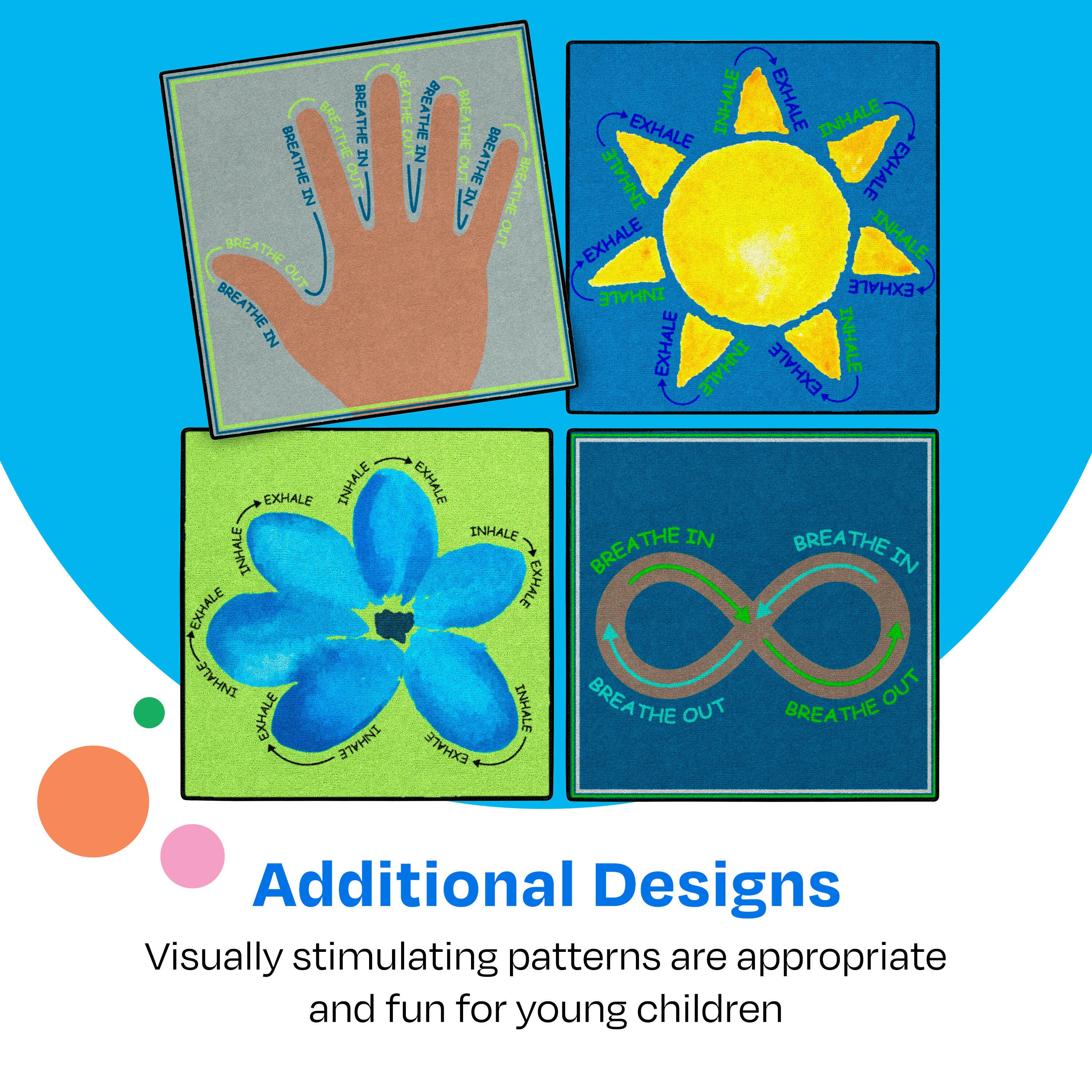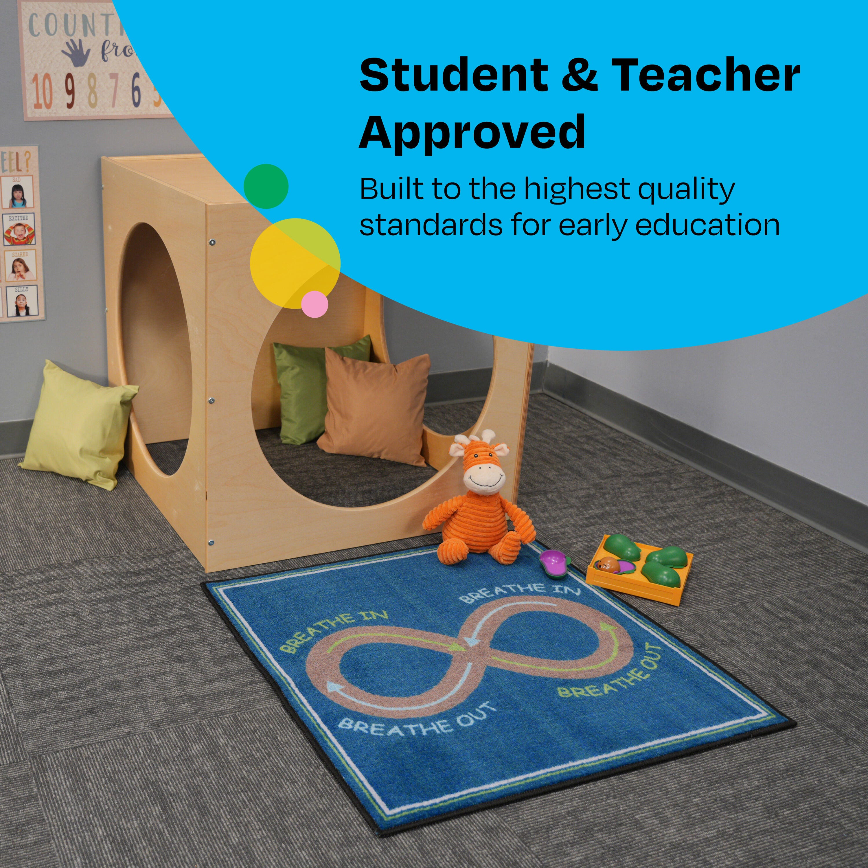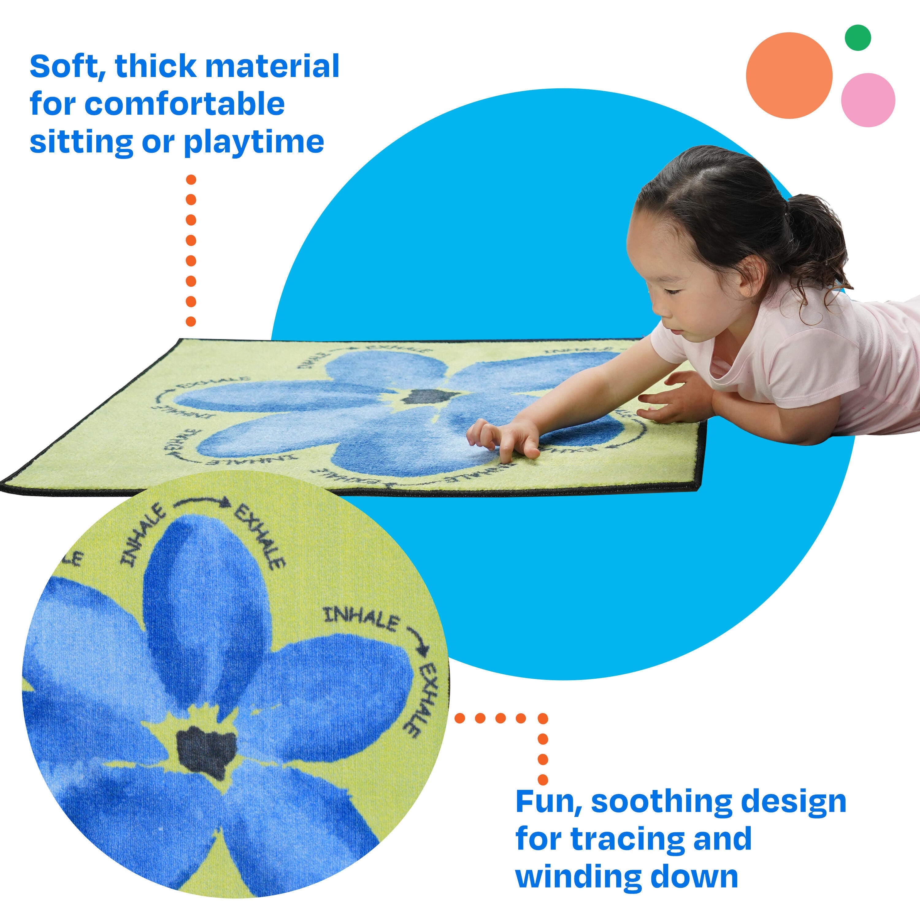 Keep children comfortable, calm, and collected on the soft and serene Breathe With Me carpet square by Childcraft! These carpet tiles teach children to take a calm breath in and out, making them the perfect soothing interactive rug experience.