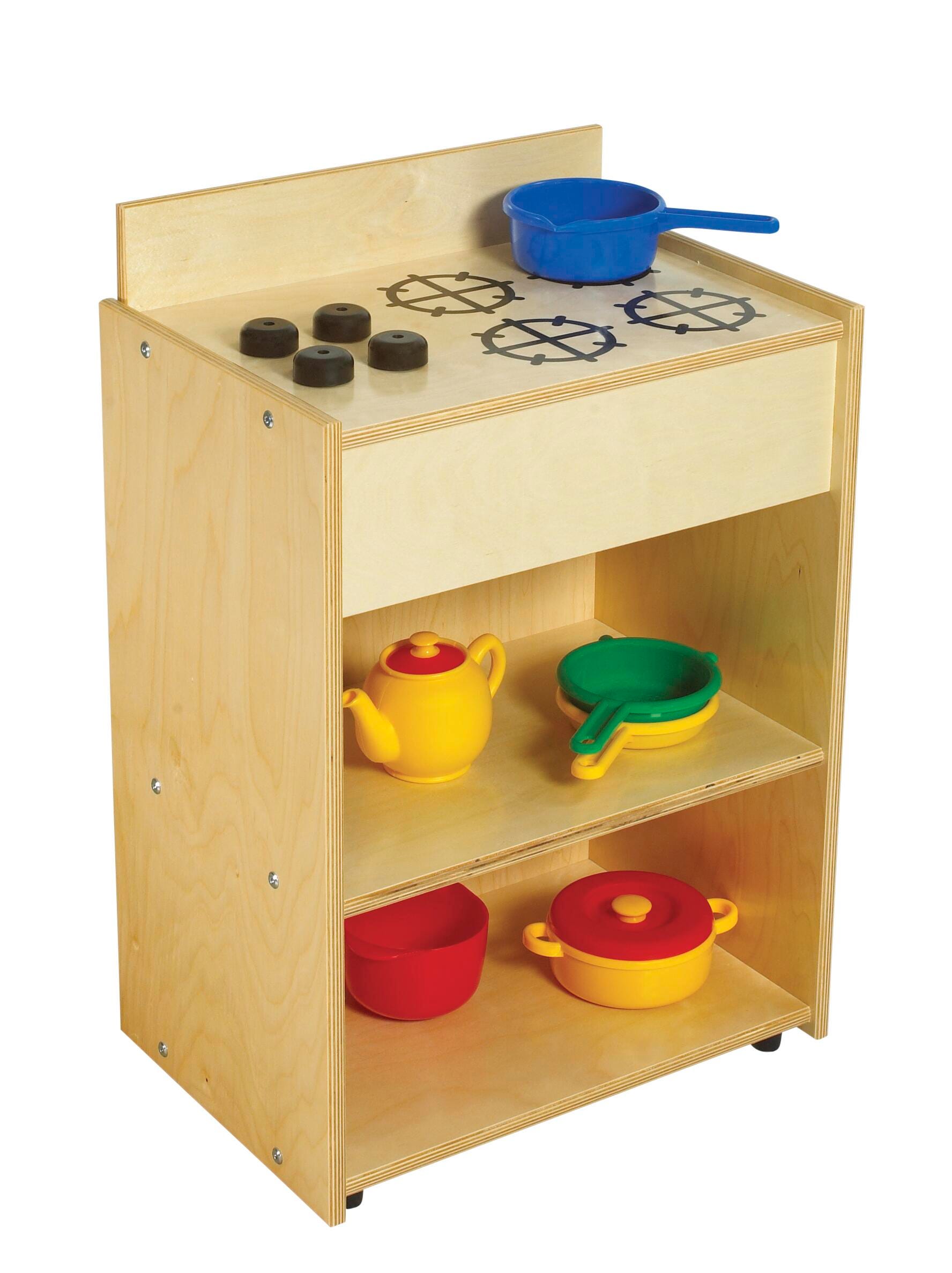 Childcraft® ABC Furnishings Play Kitchen Stove adds a realistic and interactive element to pretend play kitchens. Designed to replicate a real stove, this birch plywood unit features turning knobs and four burners, encouraging children to engage in imaginative role-playing. Lower shelves provide storage for play food, pots, pans, and utensils. Built for durability and long-lasting use, this children's stove pairs seamlessly with other Childcraft kitchen units (sold separately) to create a fully equipped play kitchen. Assembly required. Measures 19 W x 13 D x 28-1/4 H inches.Features