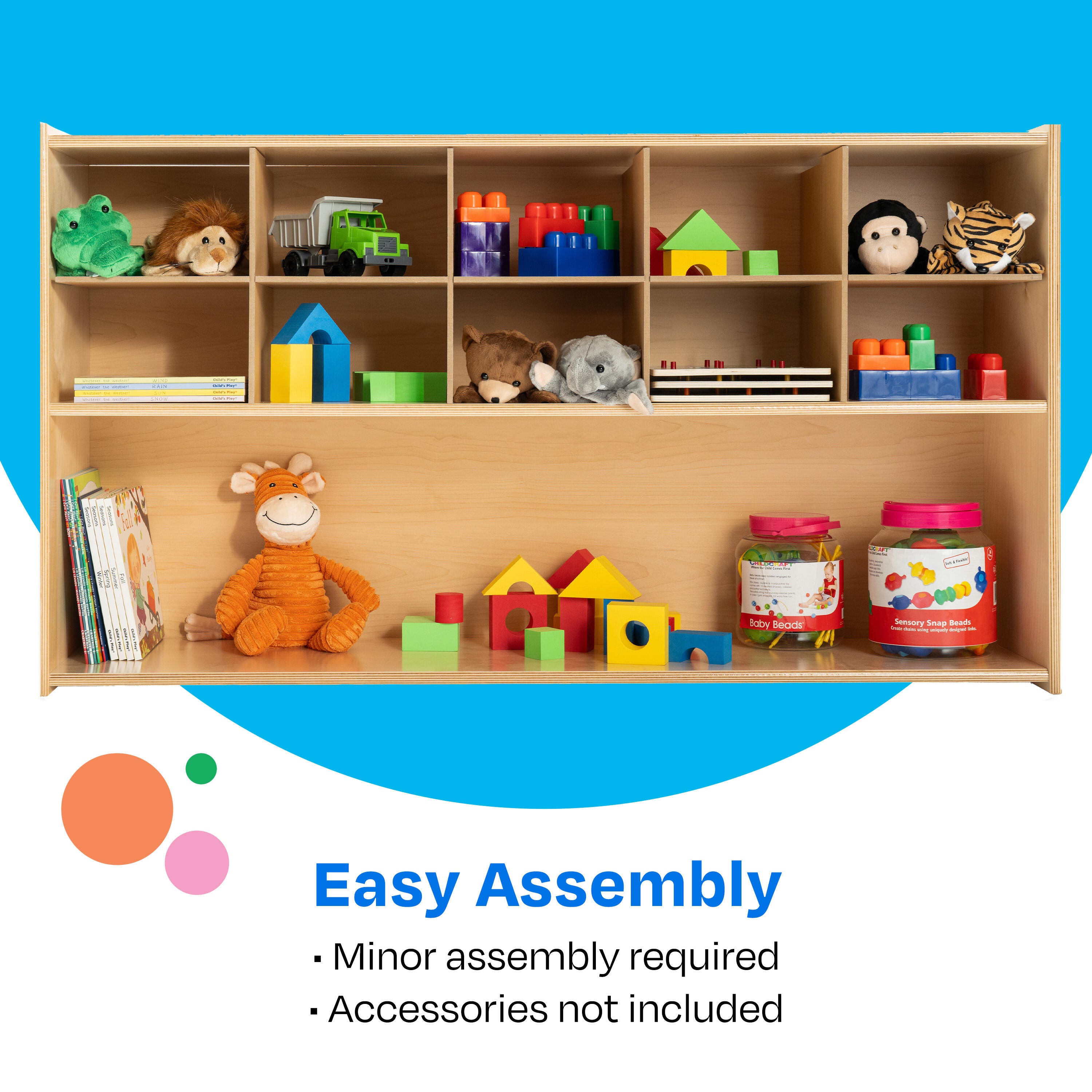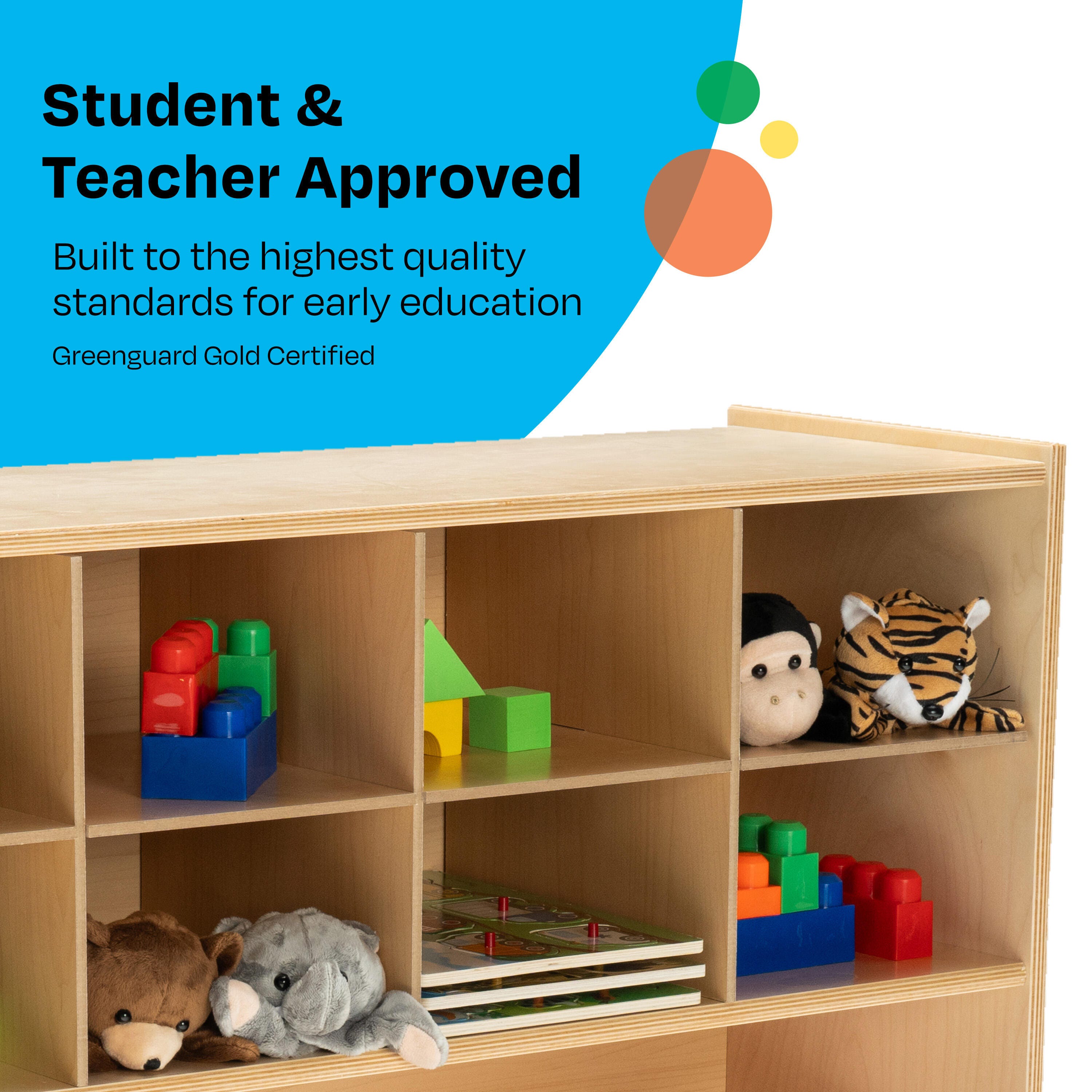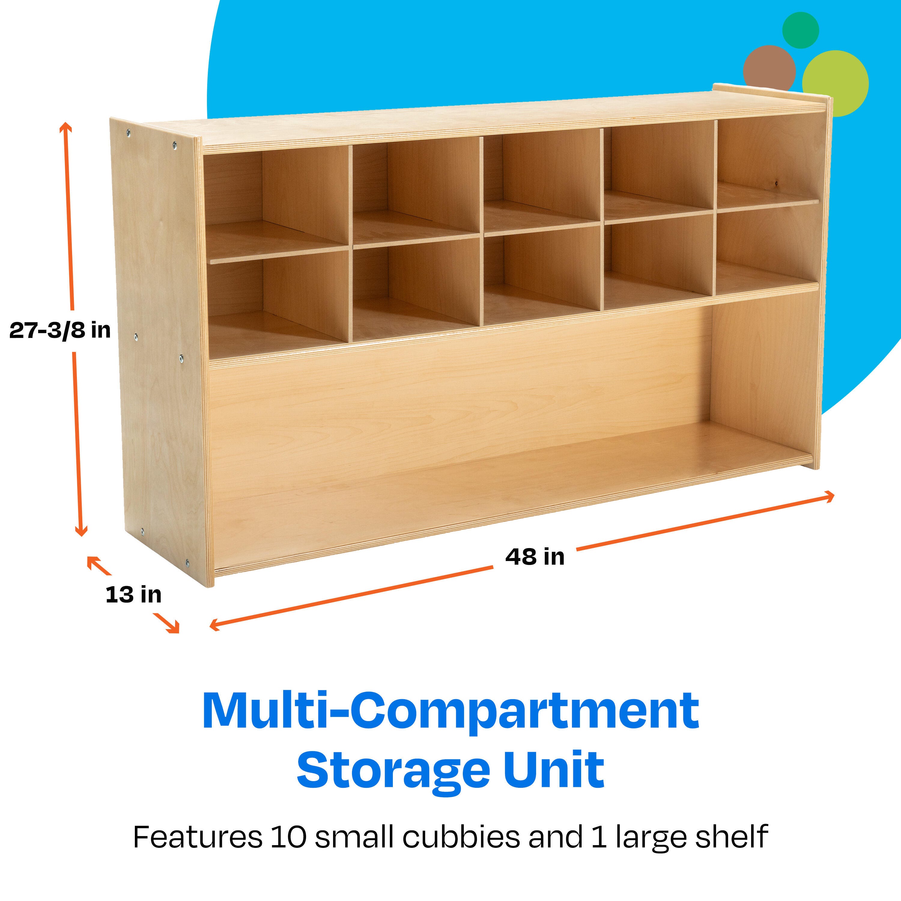 Childcraft® ABC Furnishings Storage Unit offers 10 convenient cubbies and a large shelf to keep your classroom tidy. This multi-compartment bookcase is perfect for organizing books, games, blocks, manipulatives, and more. Built with durable, all-birch veneer panels, the surfaces are easy to clean and maintain. Simple assembly required. This classroom bookcase measures 48 W x 13 D x 27-3/8 H inches.