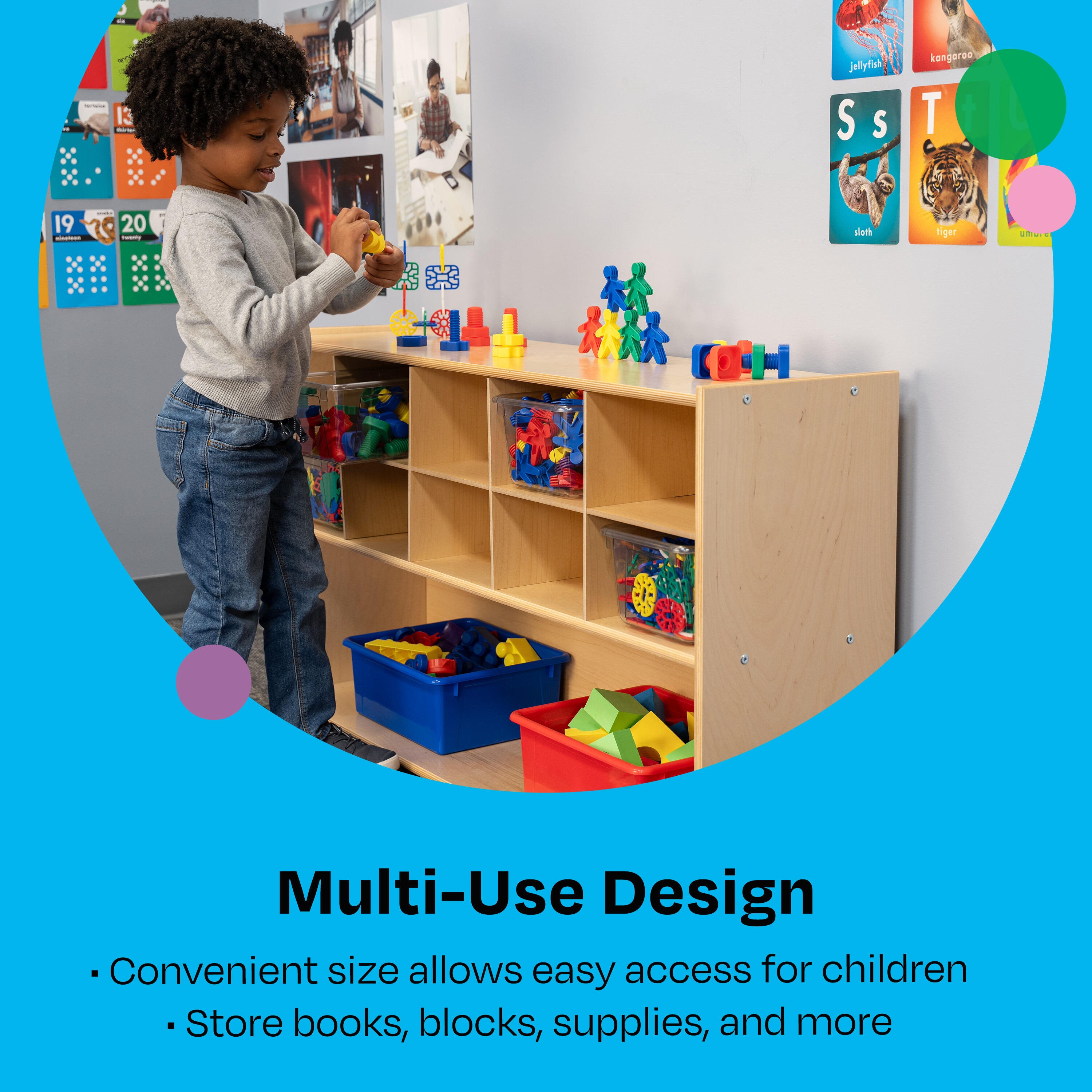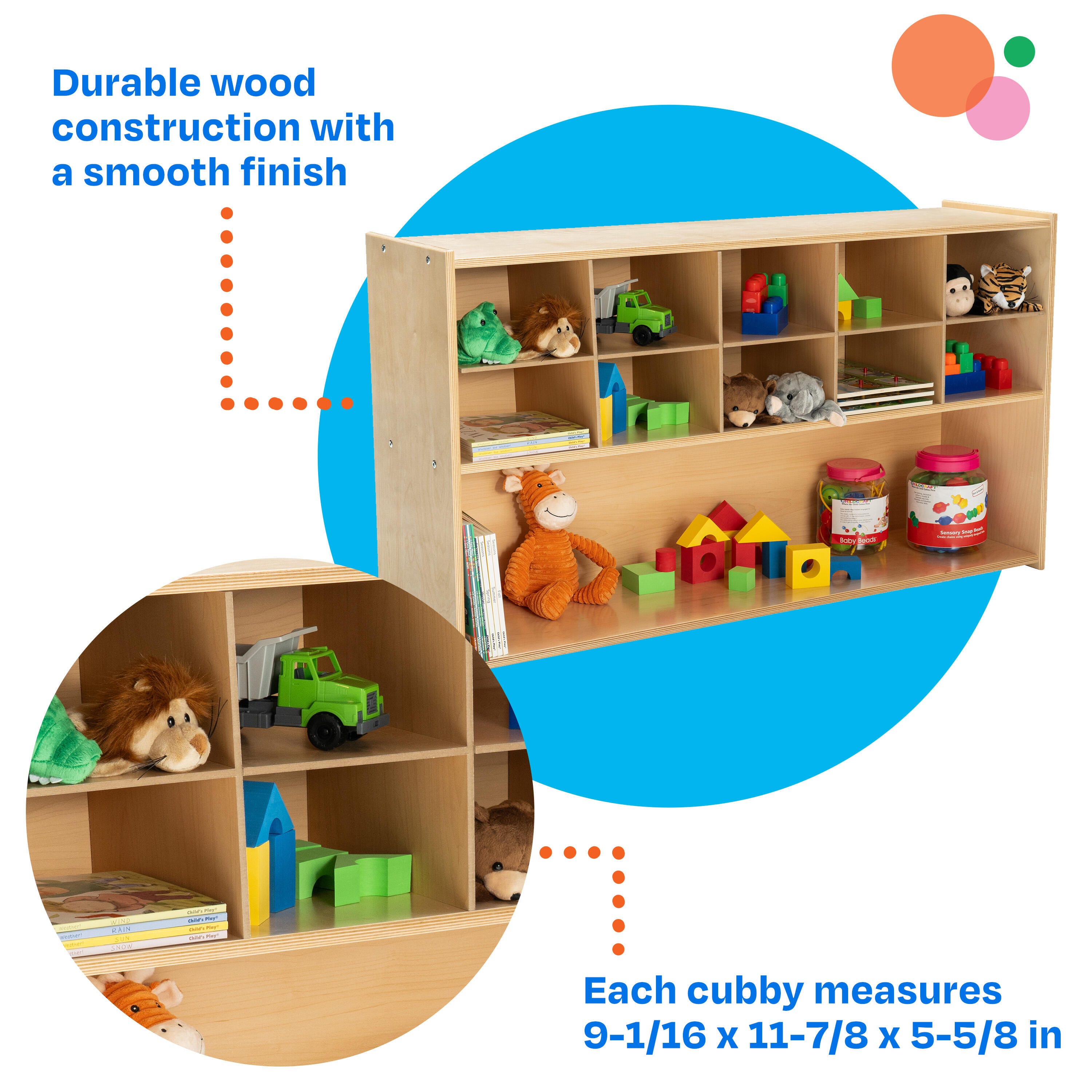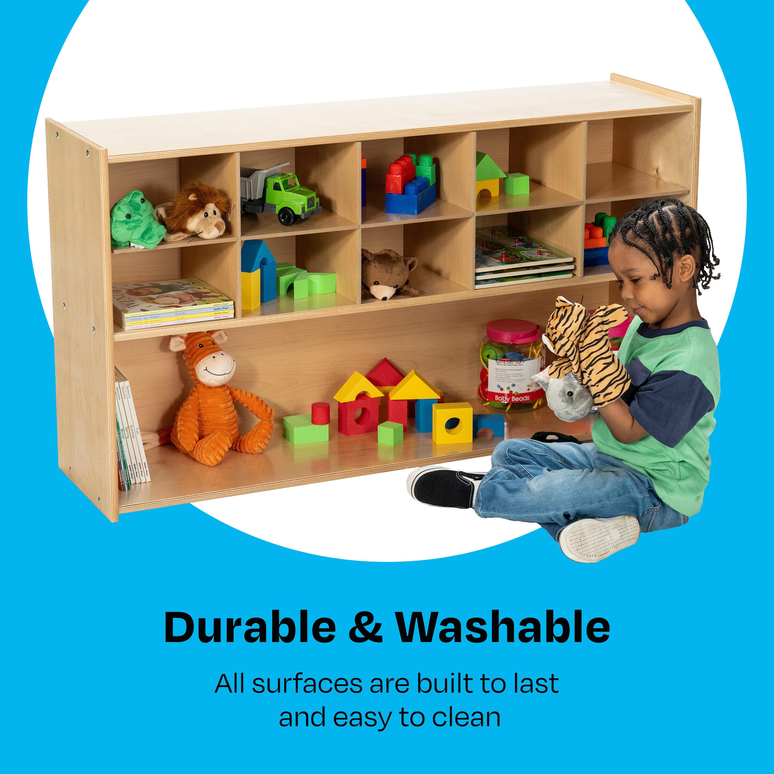 Childcraft® ABC Furnishings Storage Unit offers 10 convenient cubbies and a large shelf to keep your classroom tidy. This multi-compartment bookcase is perfect for organizing books, games, blocks, manipulatives, and more. Built with durable, all-birch veneer panels, the surfaces are easy to clean and maintain. Simple assembly required. This classroom bookcase measures 48 W x 13 D x 27-3/8 H inches.