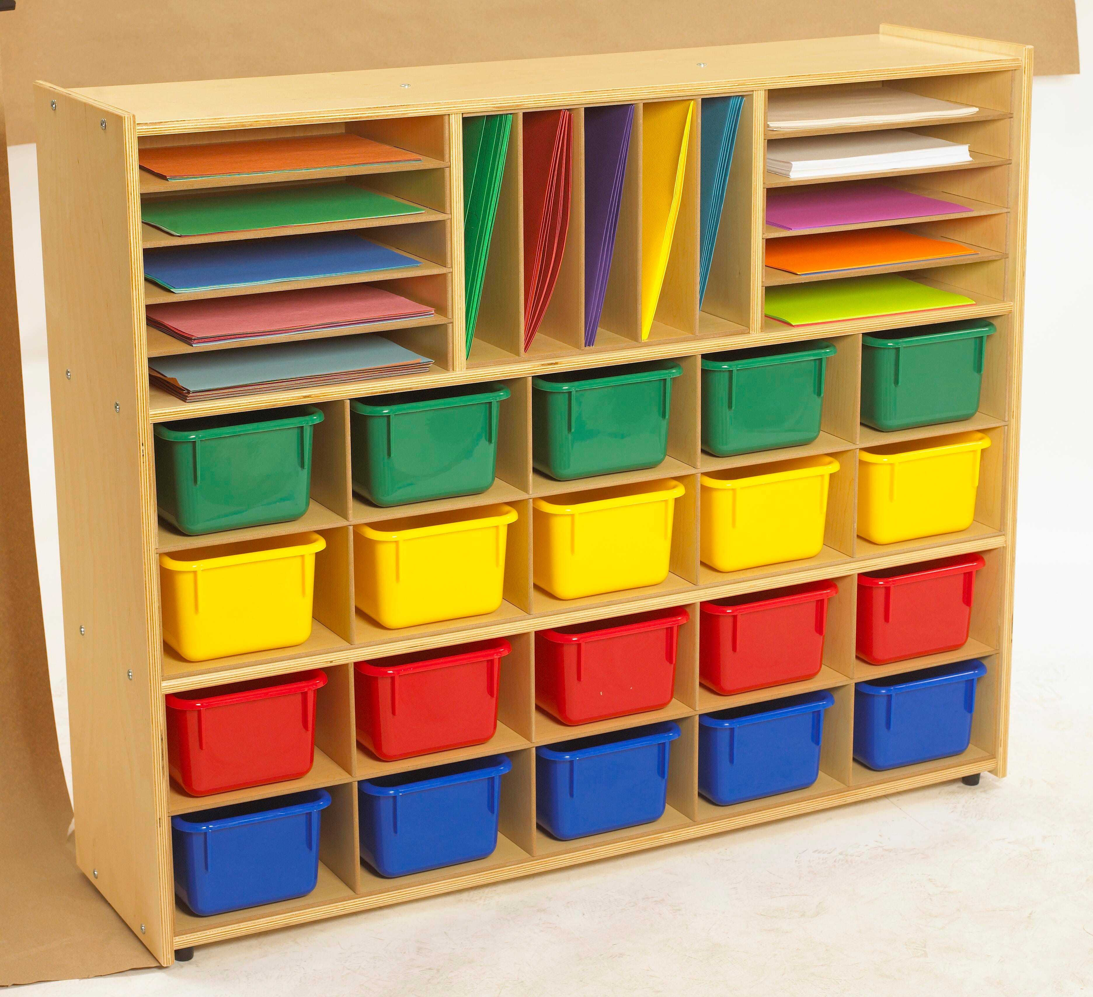 The Childcraft® ABC Furnishings Storage Unit offers ample cubby space to store books, games, supplies, and more. The open storage design allows children to independently access their belongings, while the included 20 colored trays provide easy organization for smaller items. Each bin measures 7-3/4 W x 12 D x 5-1/4 H inches. Top inserts help keep papers, mail, and homework organized. Crafted from birch plywood with a durable, stain-resistant finish, this cabinet is built to withstand daily use in busy learning environments. Measures 48 W x 13 D x 40 H inches. Assembly required.Features