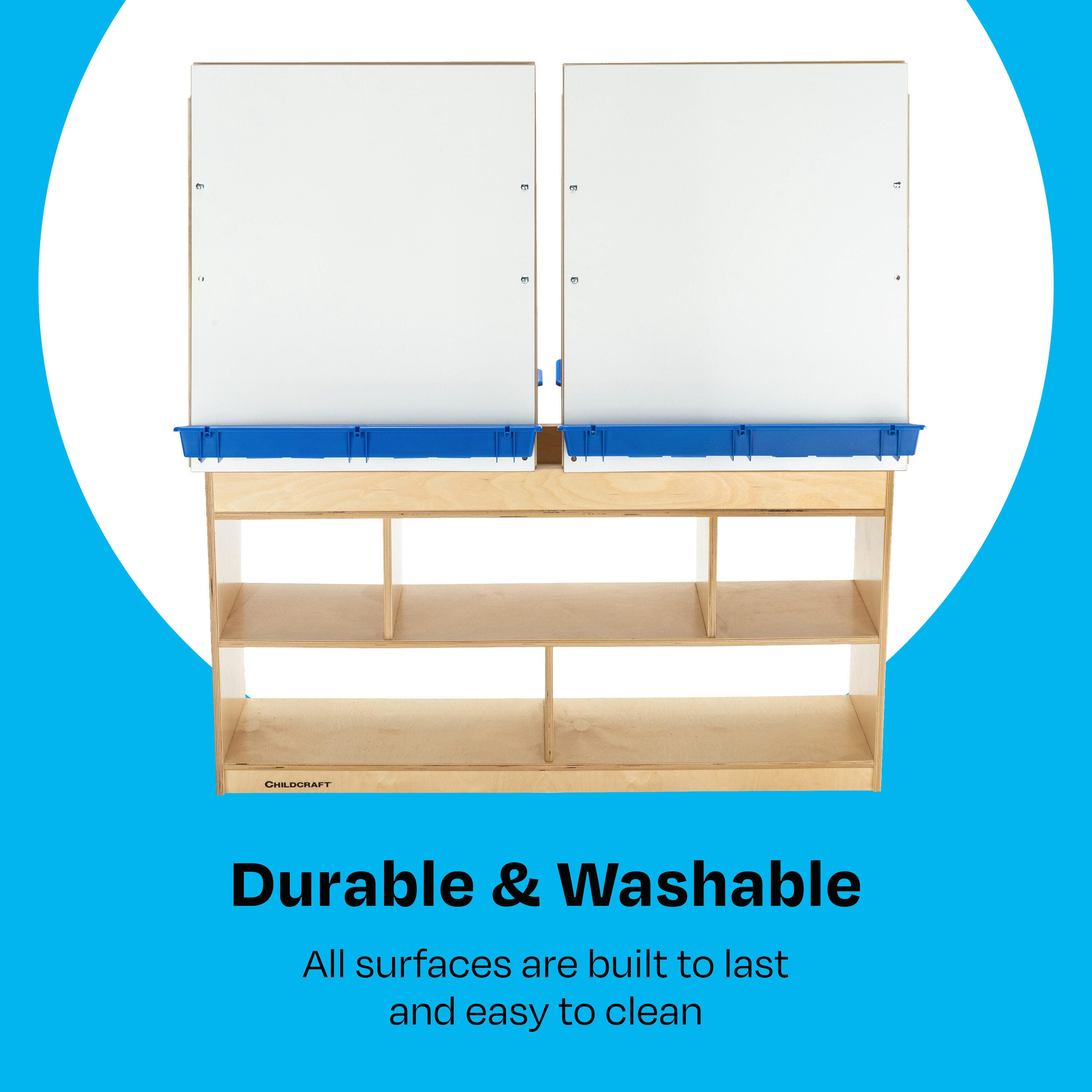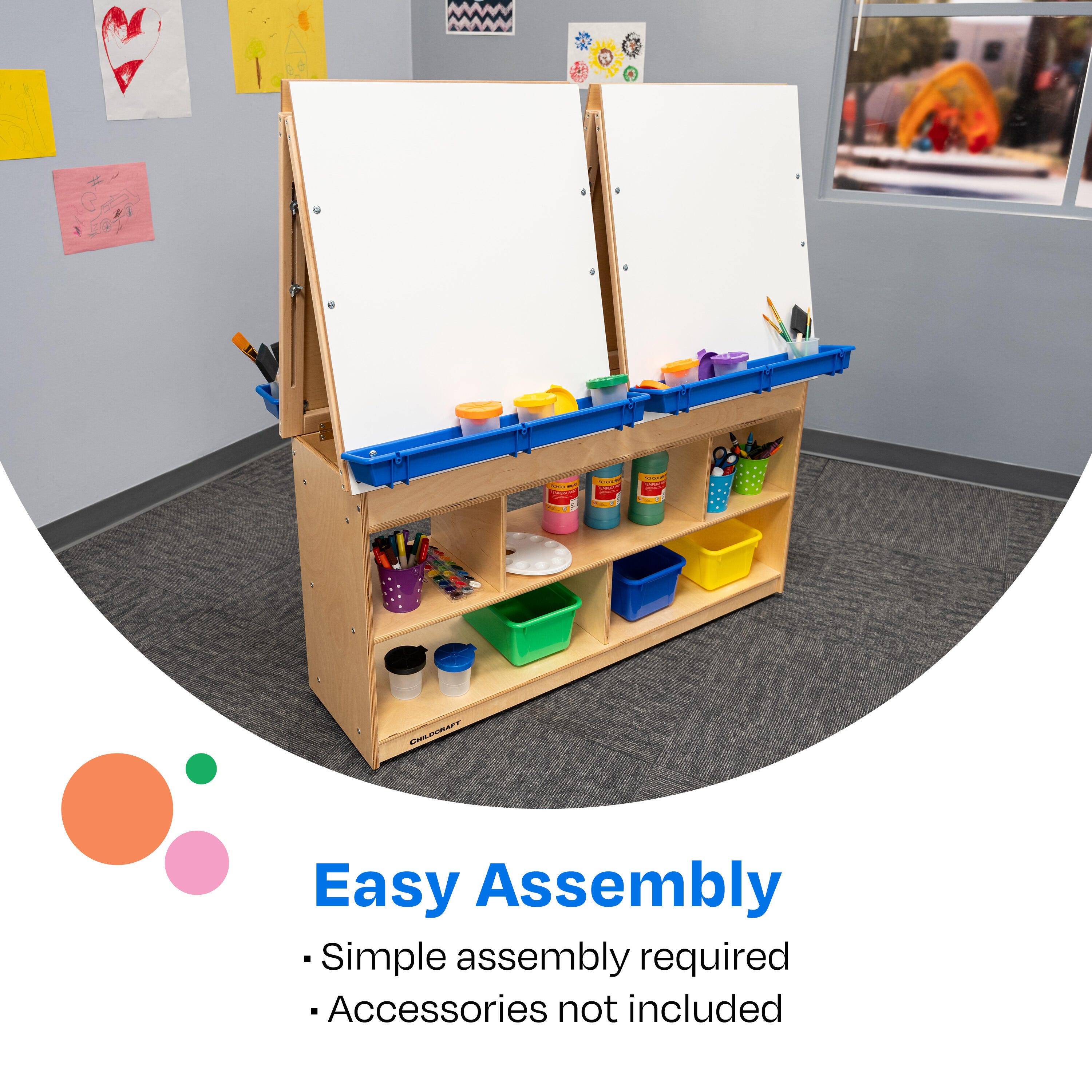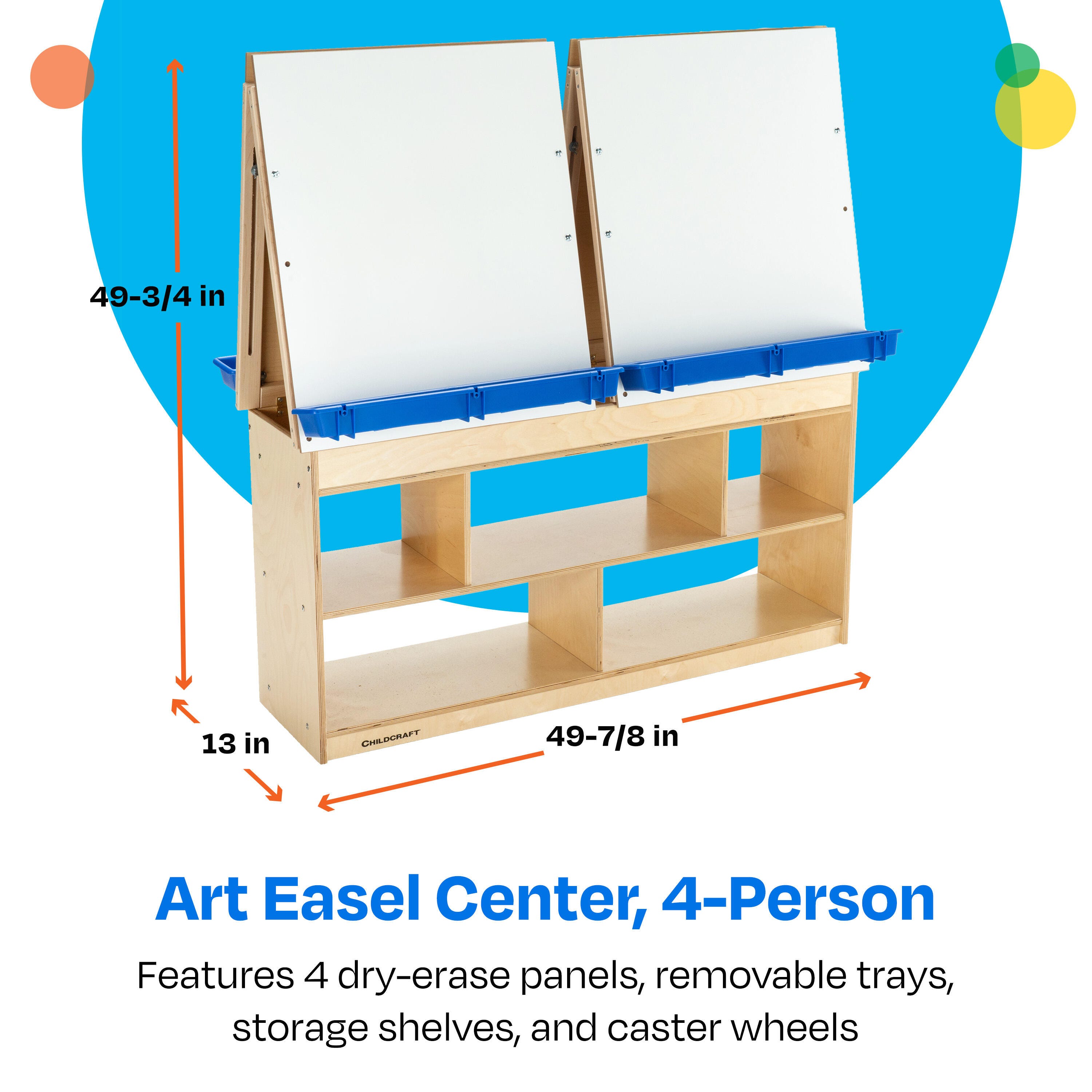 Childcraft® Art Easel Center features four dry erase panels, removable trays, and ample storage. Bottom caster wheels enable easy transportation from one corner of the room to another. Built with sturdy wooden materials for durability, this easel is designed for years of use. The wooden easel is perfect for writing, drawing, painting, or imaginative play in early childhood and elementary environments. Ample storage below is great for organizing art supplies, paints, markers, finished projects, and more. Simple assembly is required. This children’s easel measures 49-7/8 W x 13 D x 49-3/4 H inches.