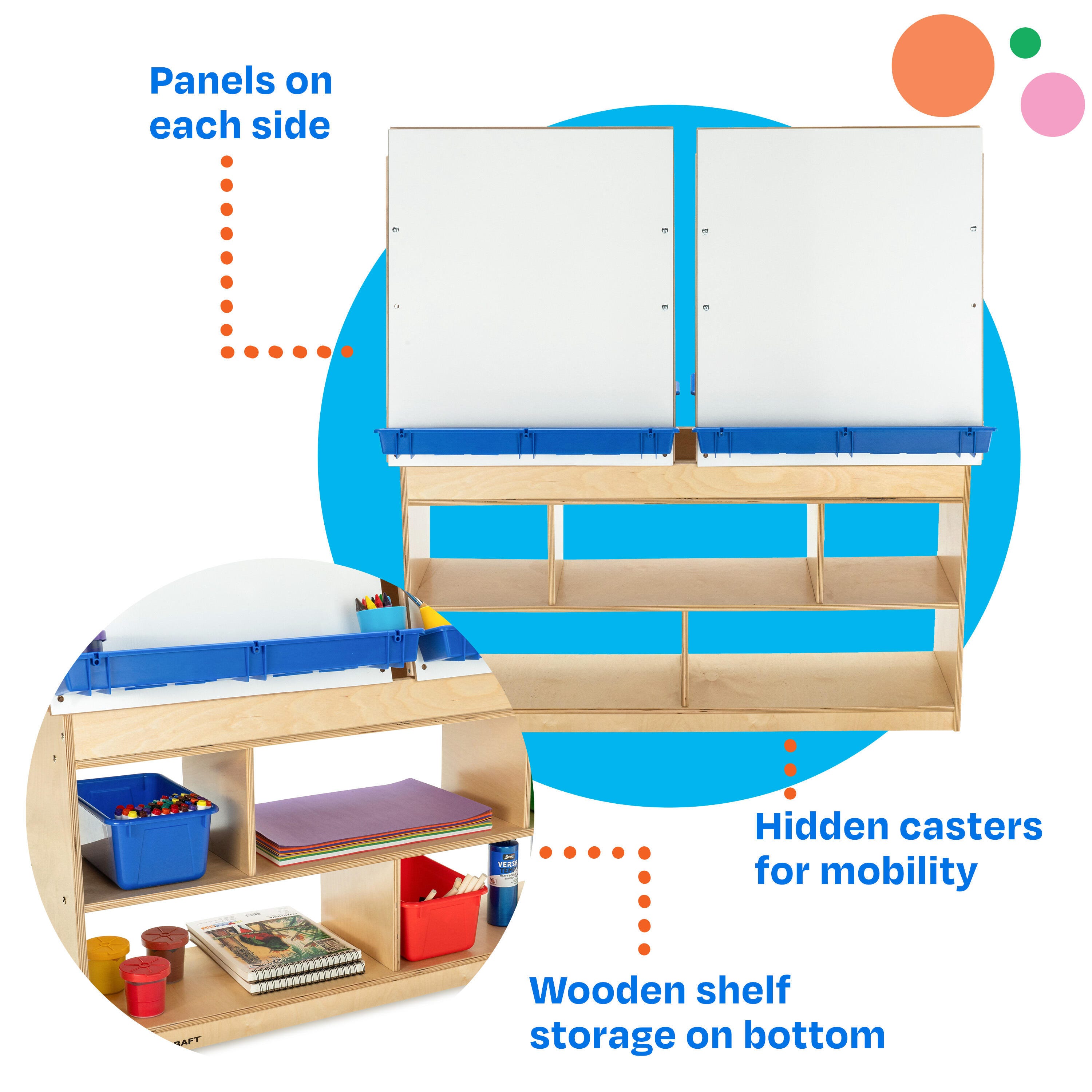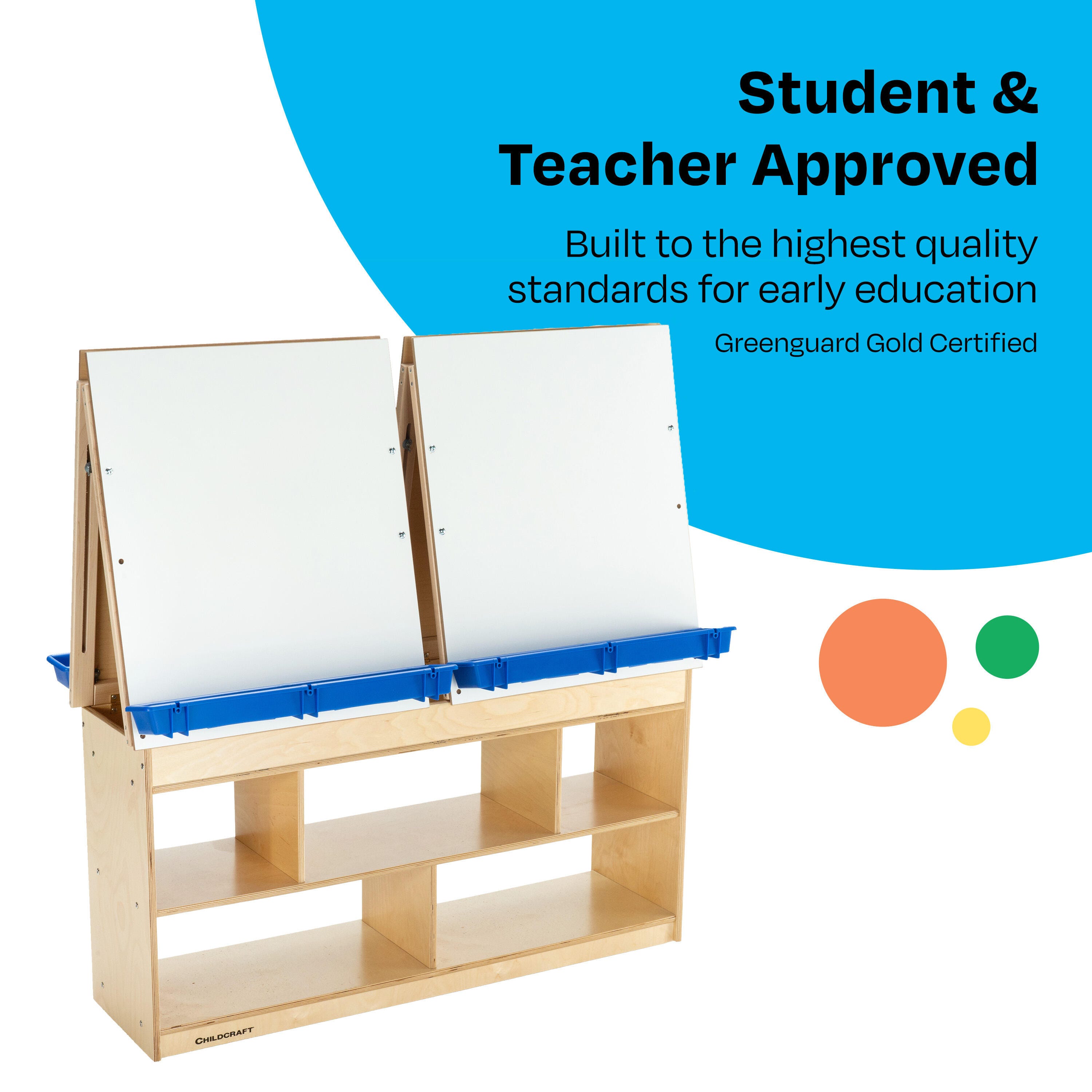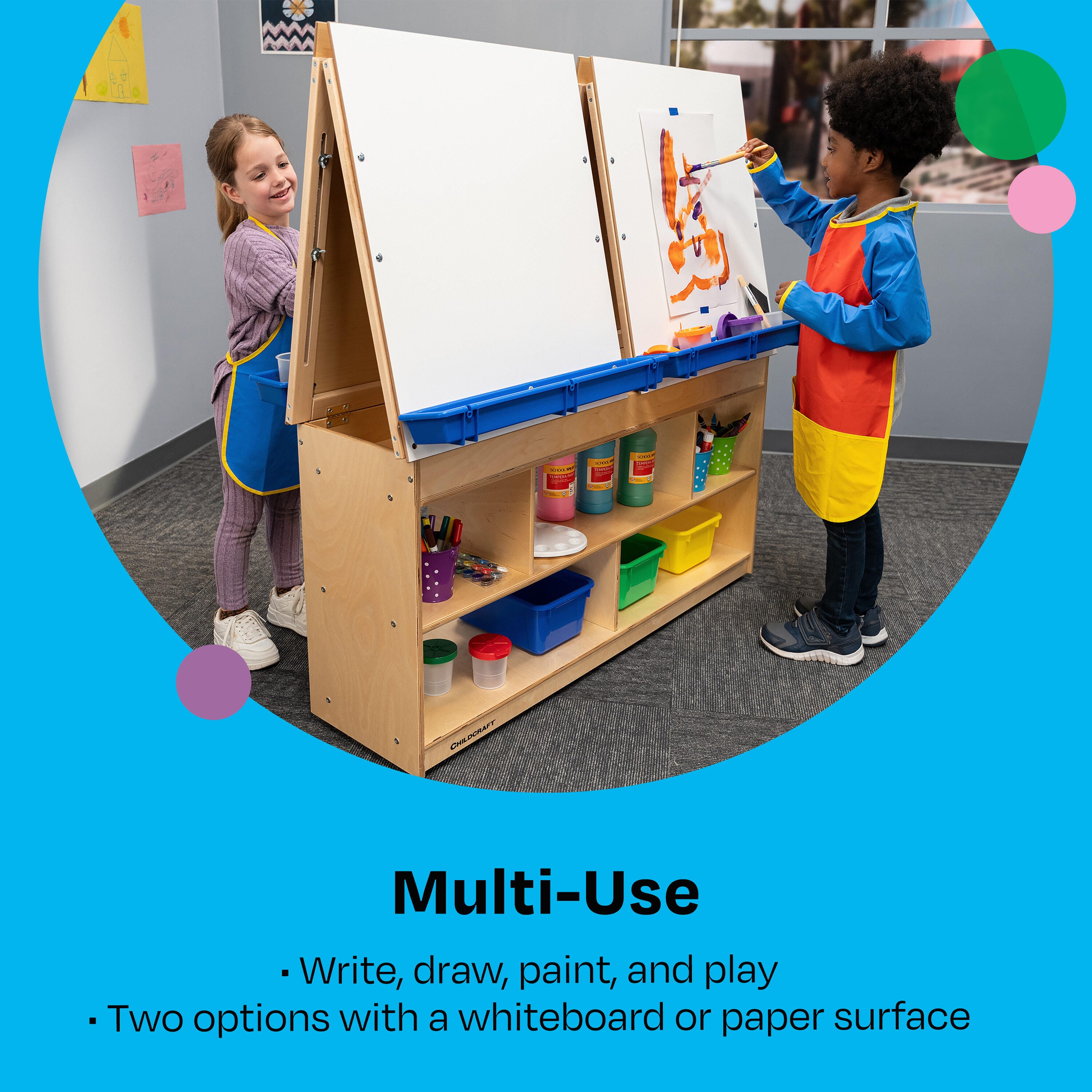 Childcraft® Art Easel Center features four dry erase panels, removable trays, and ample storage. Bottom caster wheels enable easy transportation from one corner of the room to another. Built with sturdy wooden materials for durability, this easel is designed for years of use. The wooden easel is perfect for writing, drawing, painting, or imaginative play in early childhood and elementary environments. Ample storage below is great for organizing art supplies, paints, markers, finished projects, and more. Simple assembly is required. This children’s easel measures 49-7/8 W x 13 D x 49-3/4 H inches.