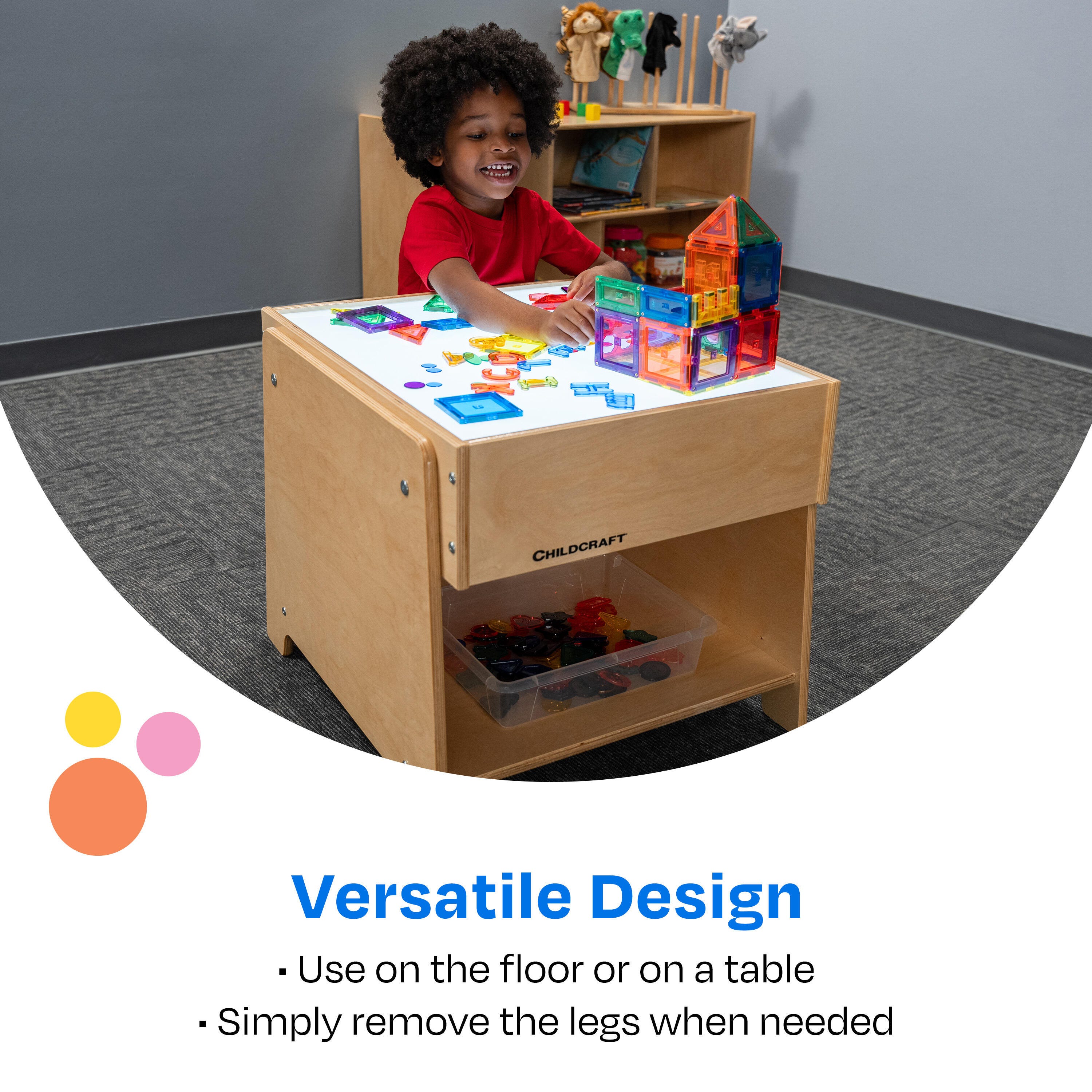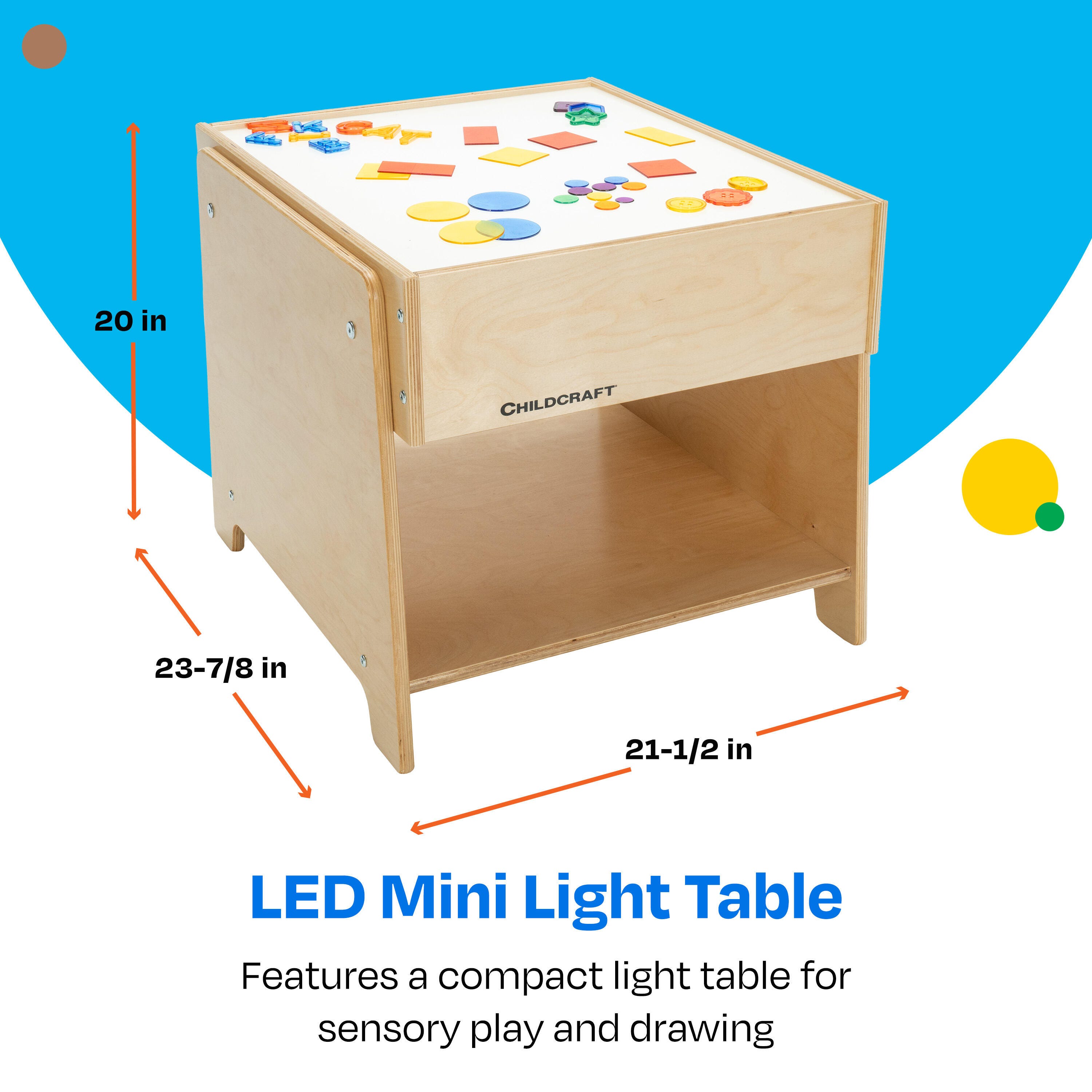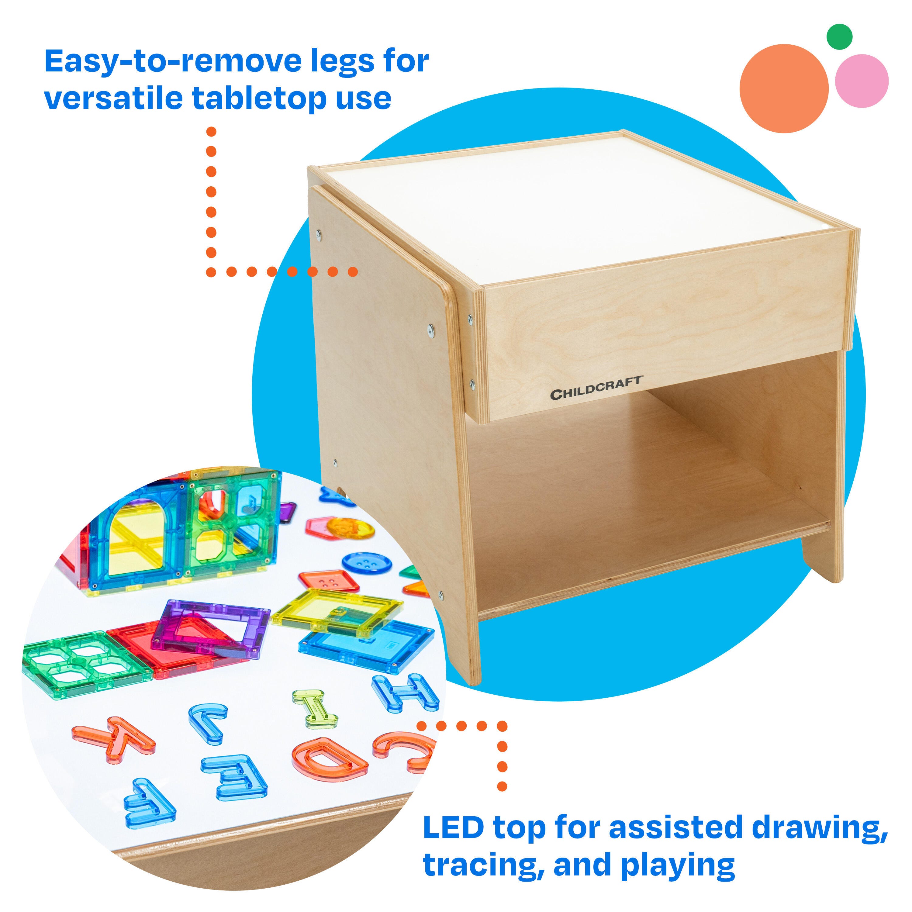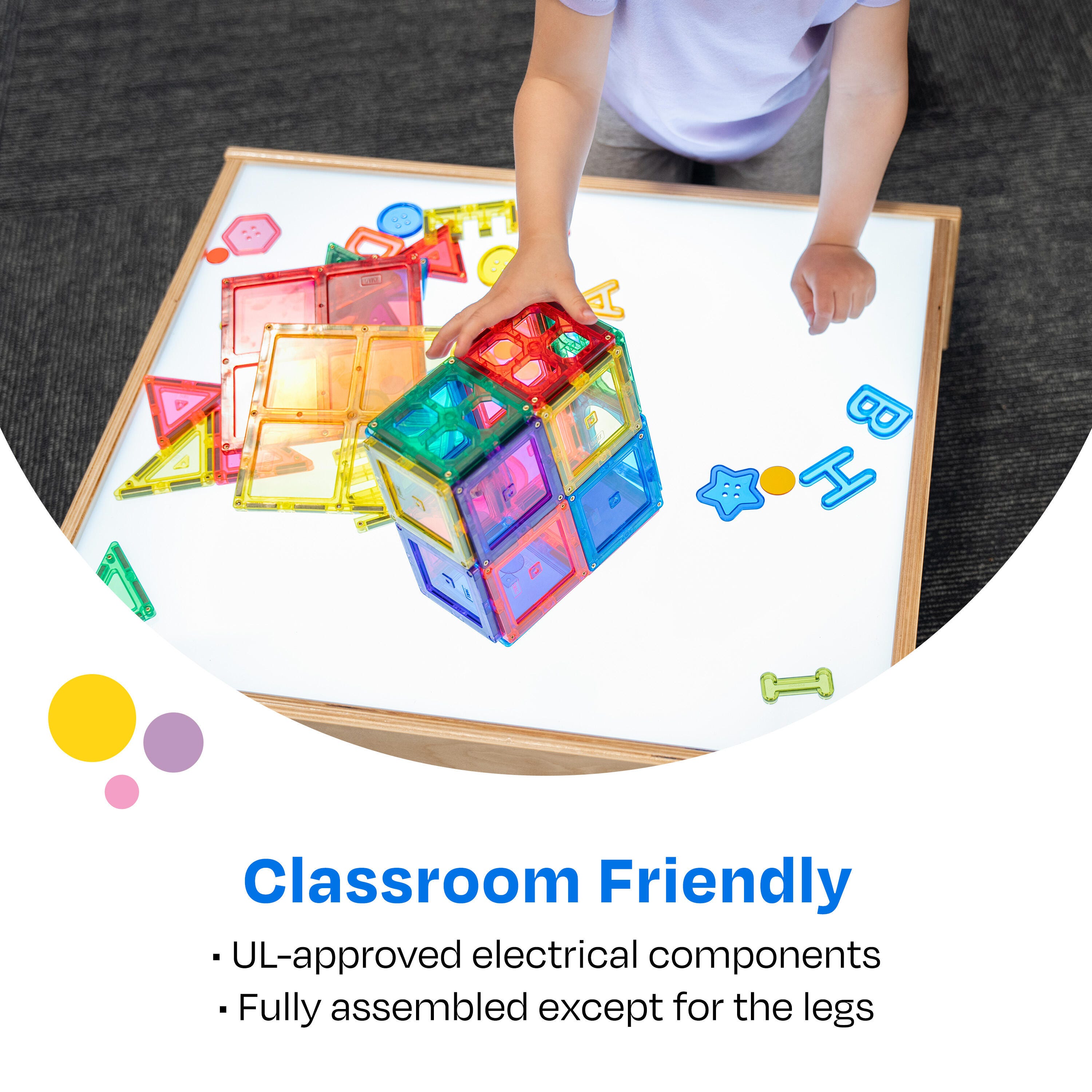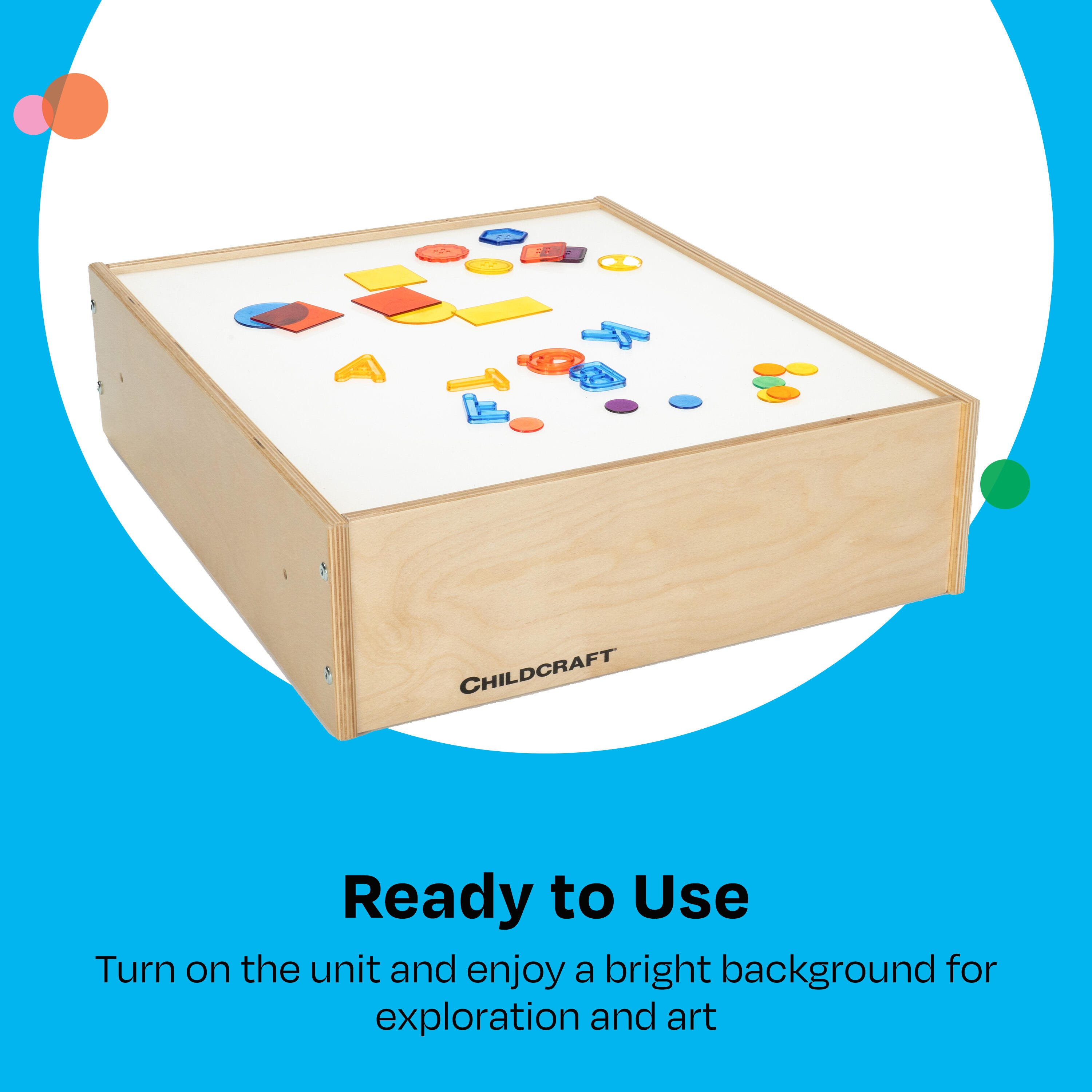 Childcraft® LED Mini Light Table for Drawing and Sensory Activities provides an educational and engaging experience. A convenient design allows for use on the floor or tables with removable legs. Use the small children’s lighted table for assisted drawing, tracing, and playing. A bright background enables the LED activity table to take art and sensory play to a new level. The unit comes fully assembled except for the legs, and it is built with UL-approved electrical components to ensure safety in early education spaces. This sensory light table measures 21-1/2 W x 23-7/8 D x 20 H inches.