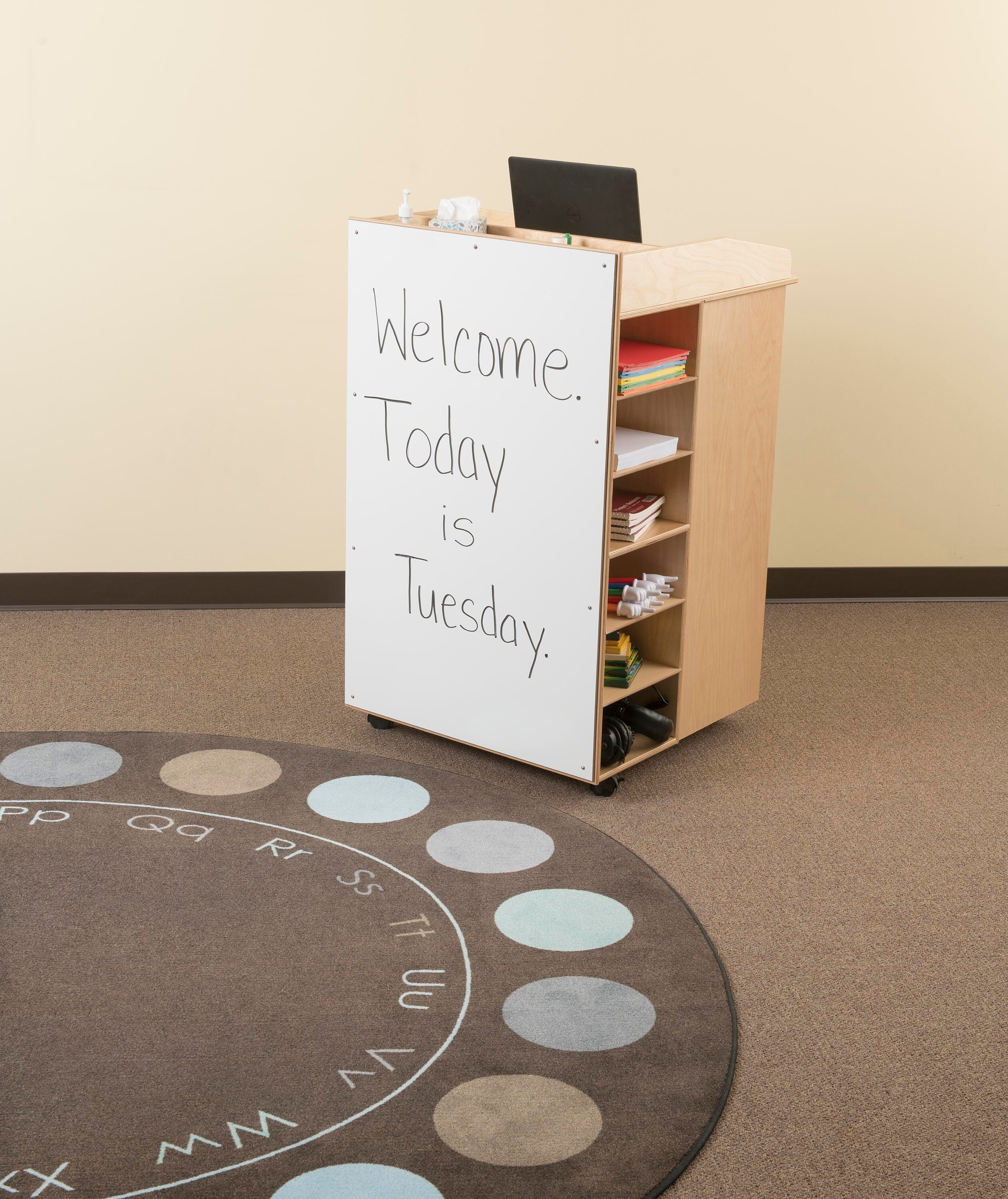 - Multi-functional design serves as a podium, mobile storage unit, and dry erase panel