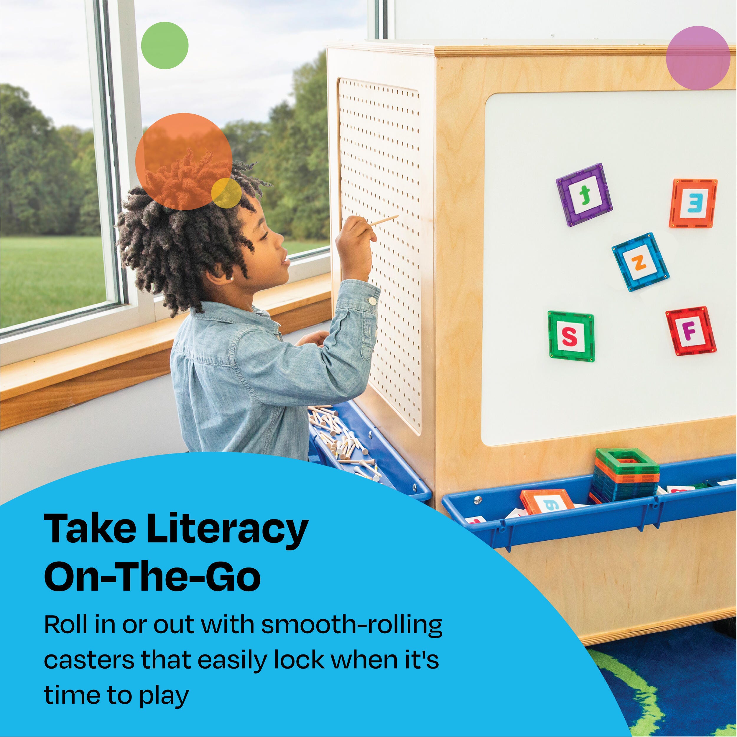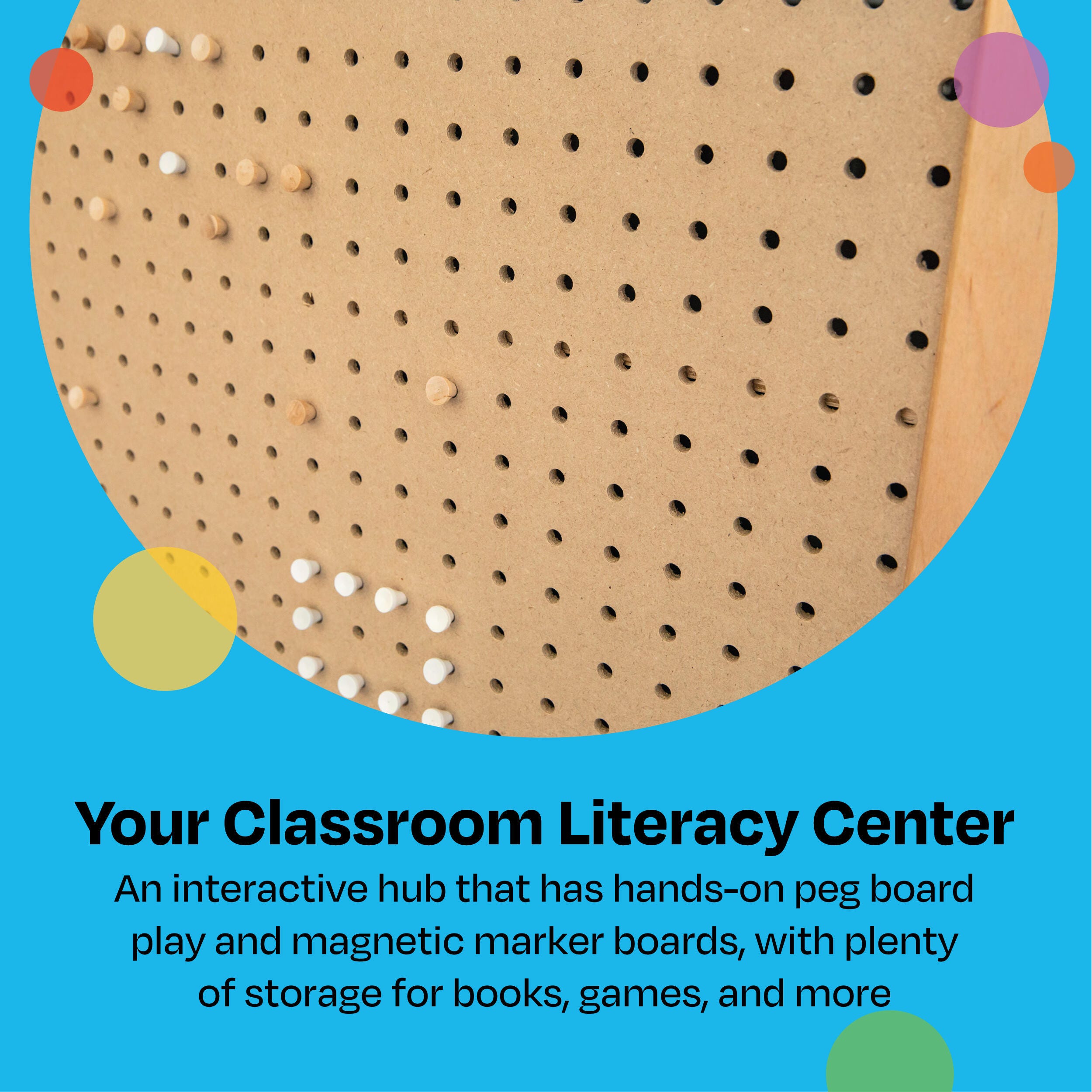 - Use the pegboard and dry erase easel for drawing, coloring, painting, peg play, circle time, language and STEM activities, and beyond