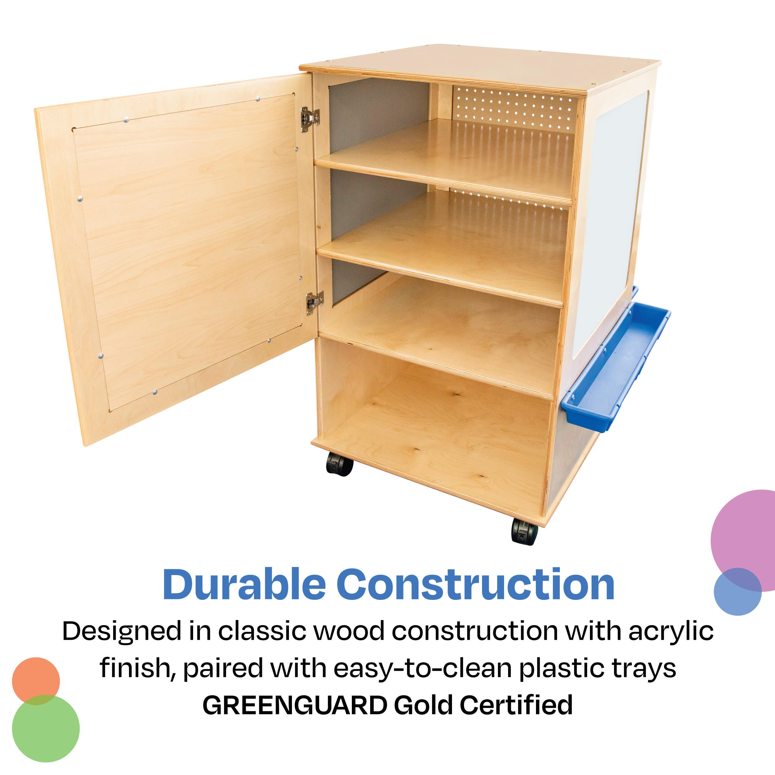 Childcraft® Mobile Learn and Store Activity Station features two magnetic dry erase boards, one whiteboard, one wooden pegboard, inner storage shelves, and outer plastic trays. Easy to use, store, and clean, the four-sided easel has heavy-duty locking caster wheels to move easily from room to room. Use the multi-functional arts and crafts stand for preschools, elementary schools, early childhood programs, child development centers, and headstart centers. This unit comes assembled and can accommodate four children at once. The rolling unit measures 25-1/2 W x 25-1/2 D x 42 H inches.Features