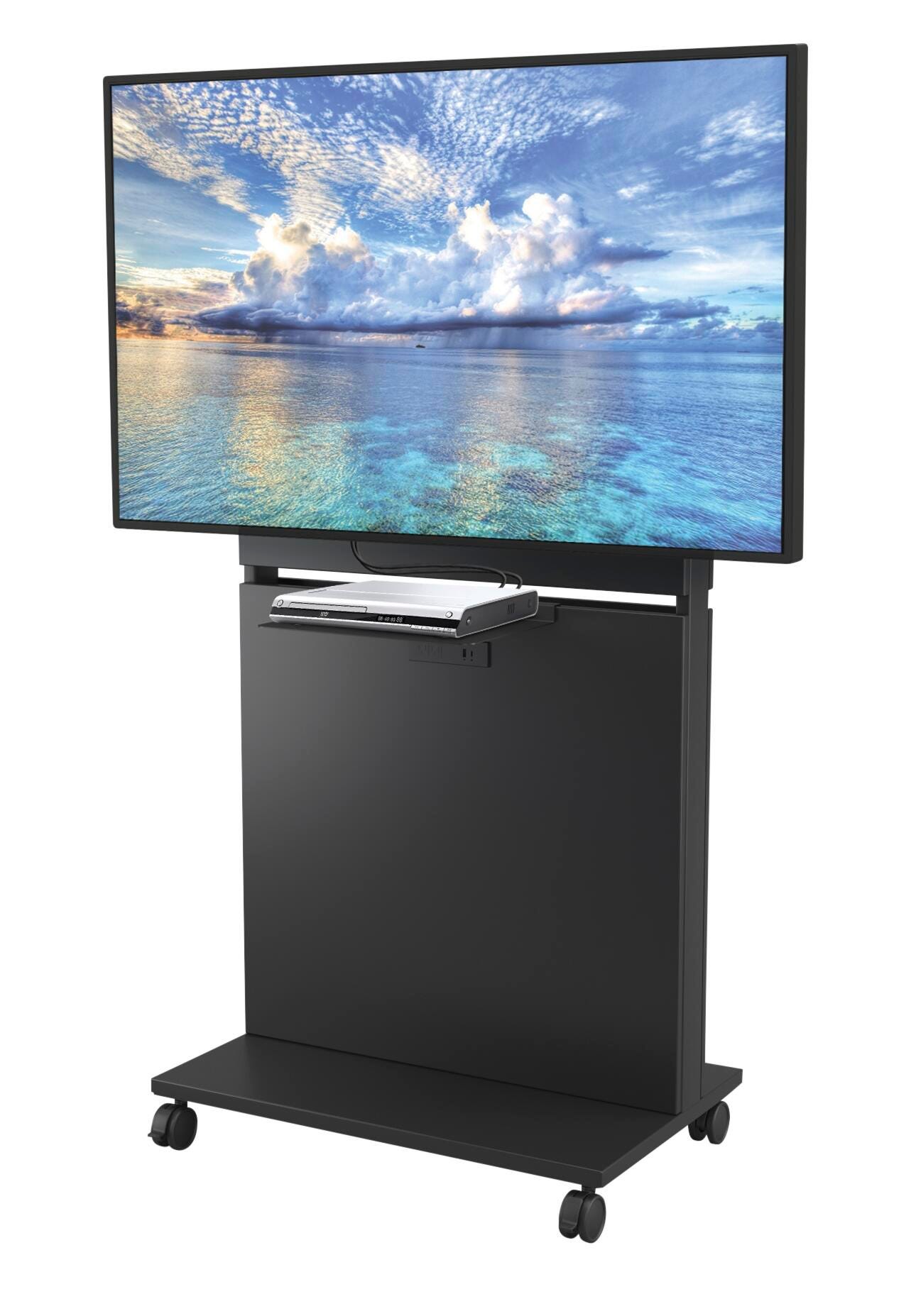 The Classroom Select Media Wall and Cart System with power provide an easy transition for a multimedia learning environment. The unit accommodates a flat panel display up to 60 inches or 125 pounds. The black laminate finish adds a modern twist with a removable back panel for easy access to equipment and cables. Keep cables organized with the wire channel in the main pillar by using the multiple grommets. Four durable casters allow for easy mobility and lock for safe stability.Features