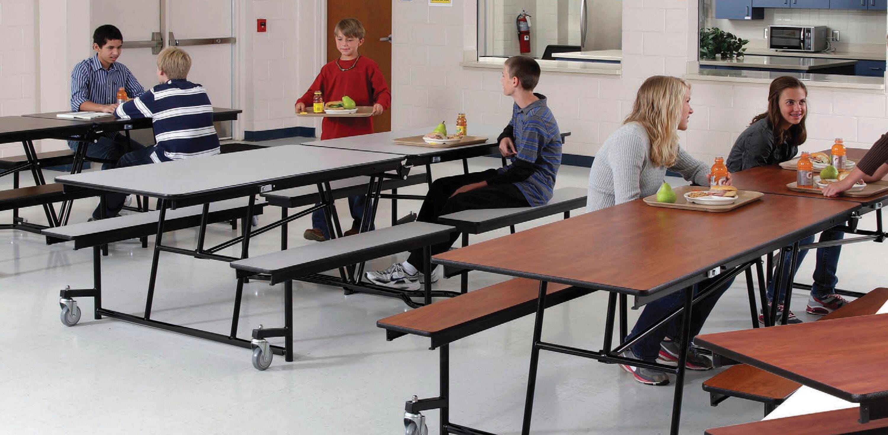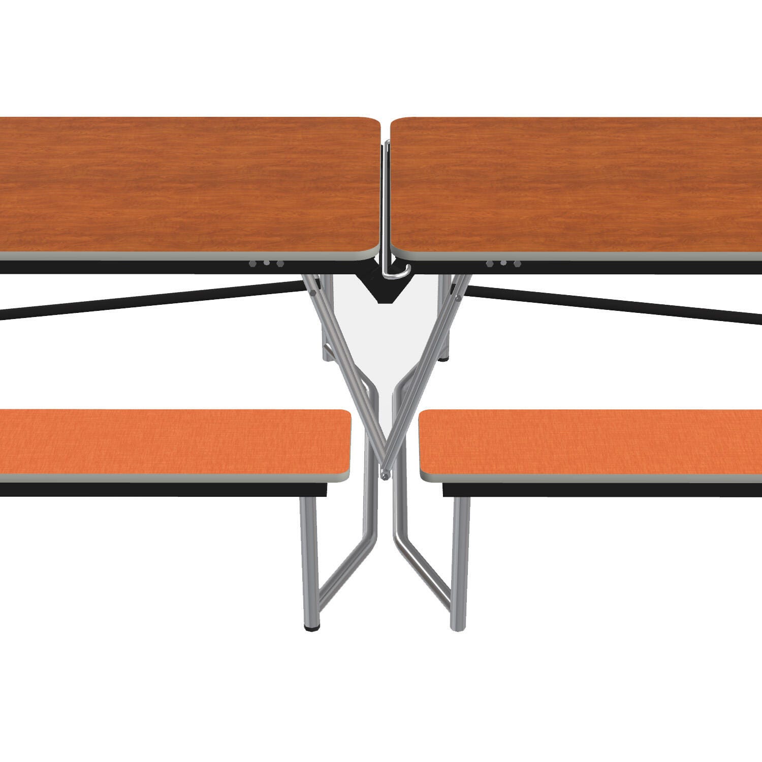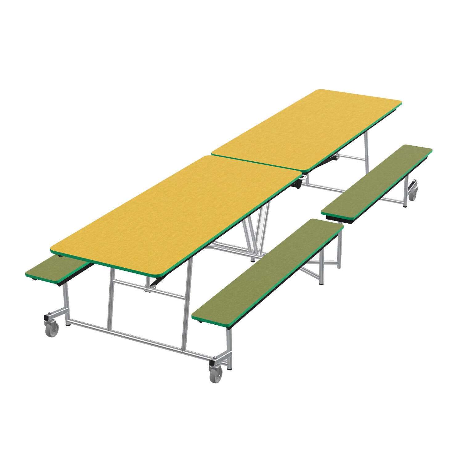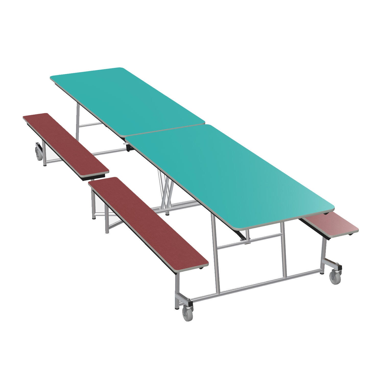 This mobile cafeteria table with fixed benches is made from your choice of high-pressure laminate bonded to a 3/4-inch plywood core with LockEdge or T-Mold, high-pressure laminate bonded to a 3/4-inch MDF core with LockEdge, or high-pressure laminate bonded to 3/4-inch particleboard with T-Mold edging. Choose from our 42 laminate options for the tabletop and corresponding bench seating. This table comes in three table lengths, two heights, and is available in either a chrome or black frame. Features a lift-off caster leg design to ensure this table will not roll while in use.