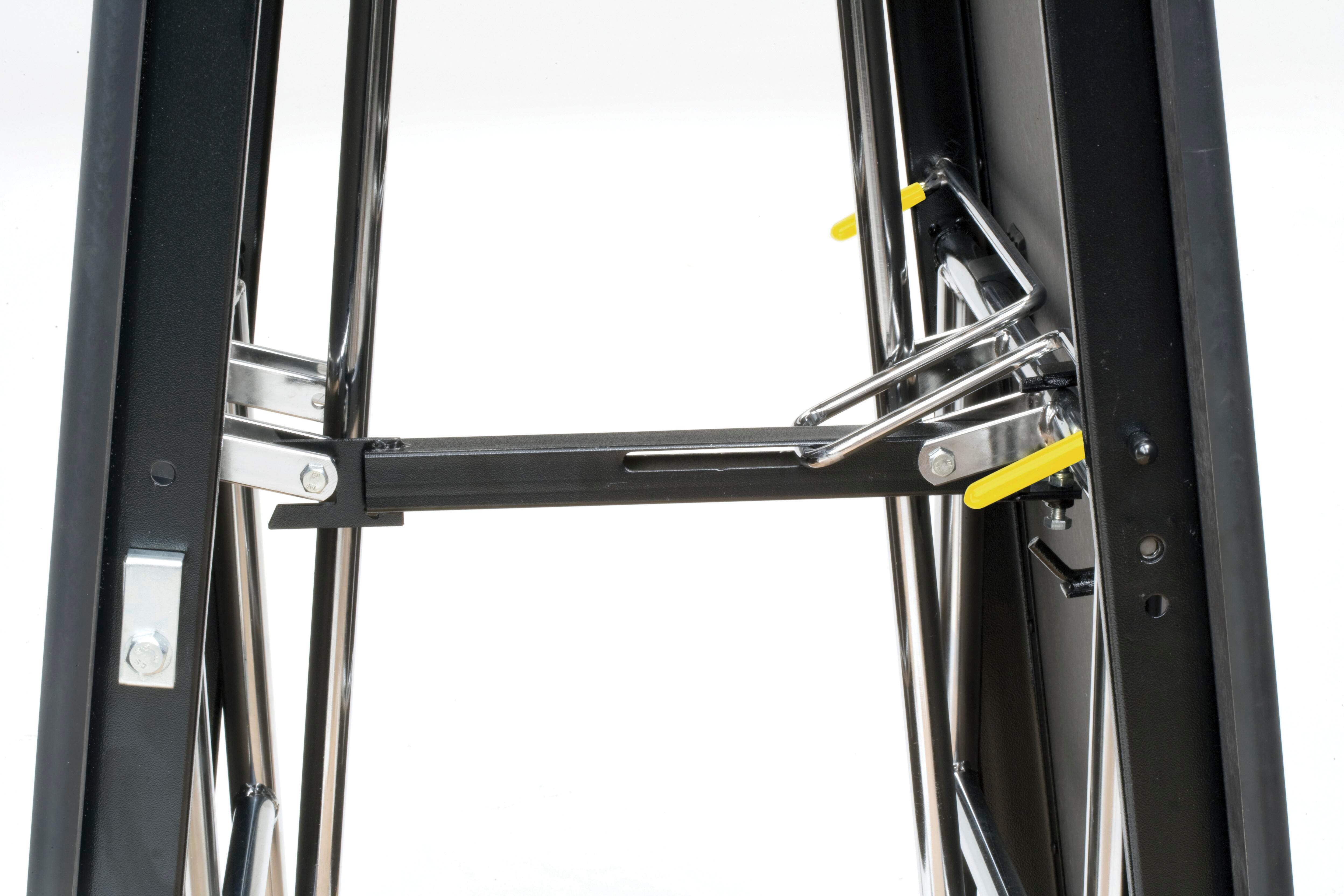 The Mobile Fixed Bench Table features a two-stage security lock that secures table in an open position or partially opened for floor maintenance. The exclusive torsion bar easy-lift system provides smooth easy opening and closing every step of the way.