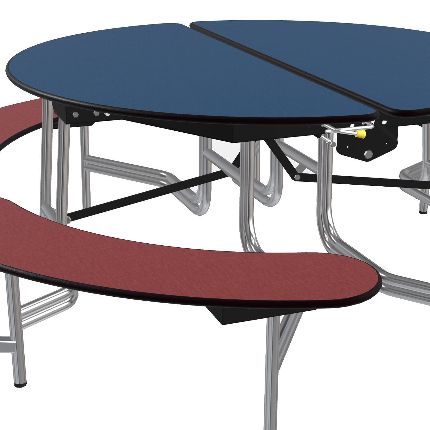 The Mobile Fixed Bench Table features a two-stage security lock that secures table in an open position or partially opened for floor maintenance. The exclusive torsion bar easy-lift system provides smooth easy opening and closing every step of the way.