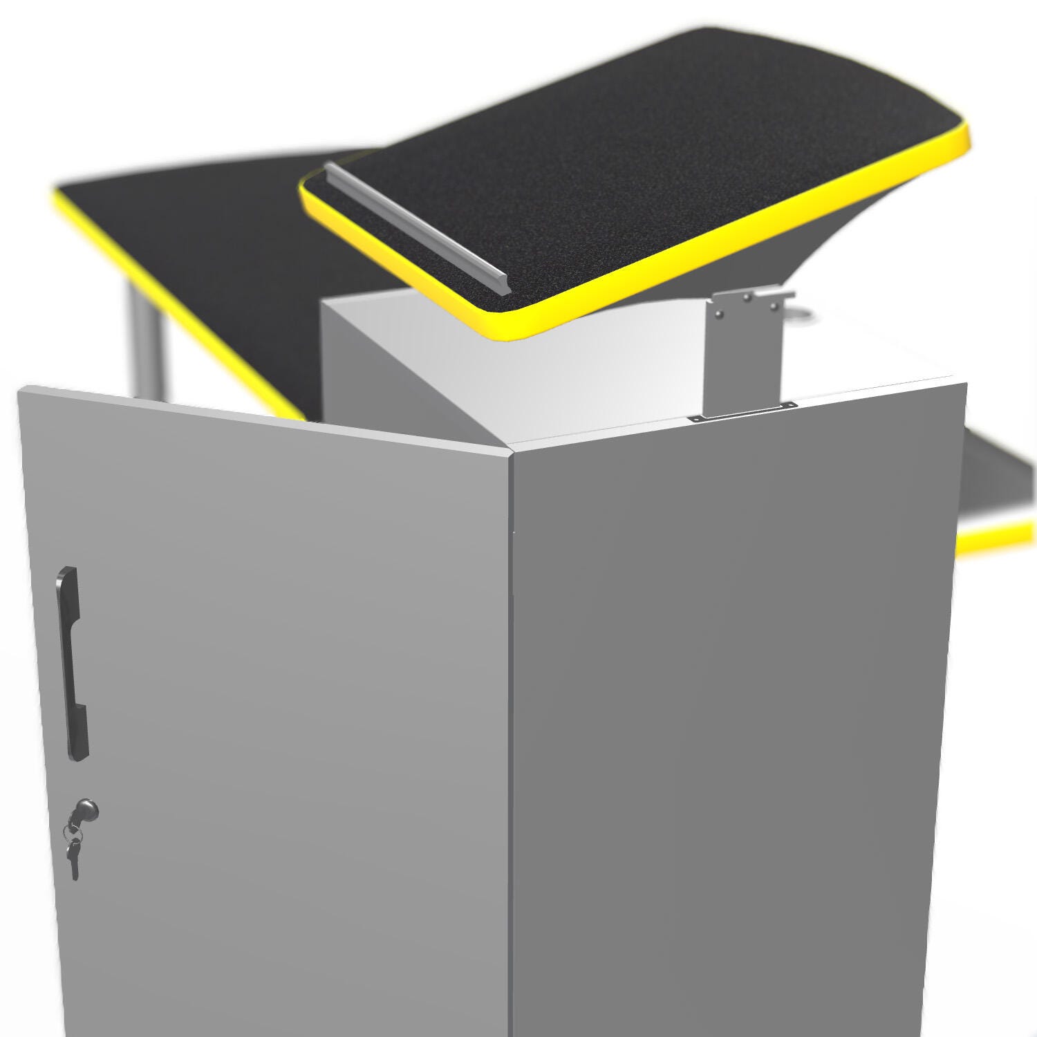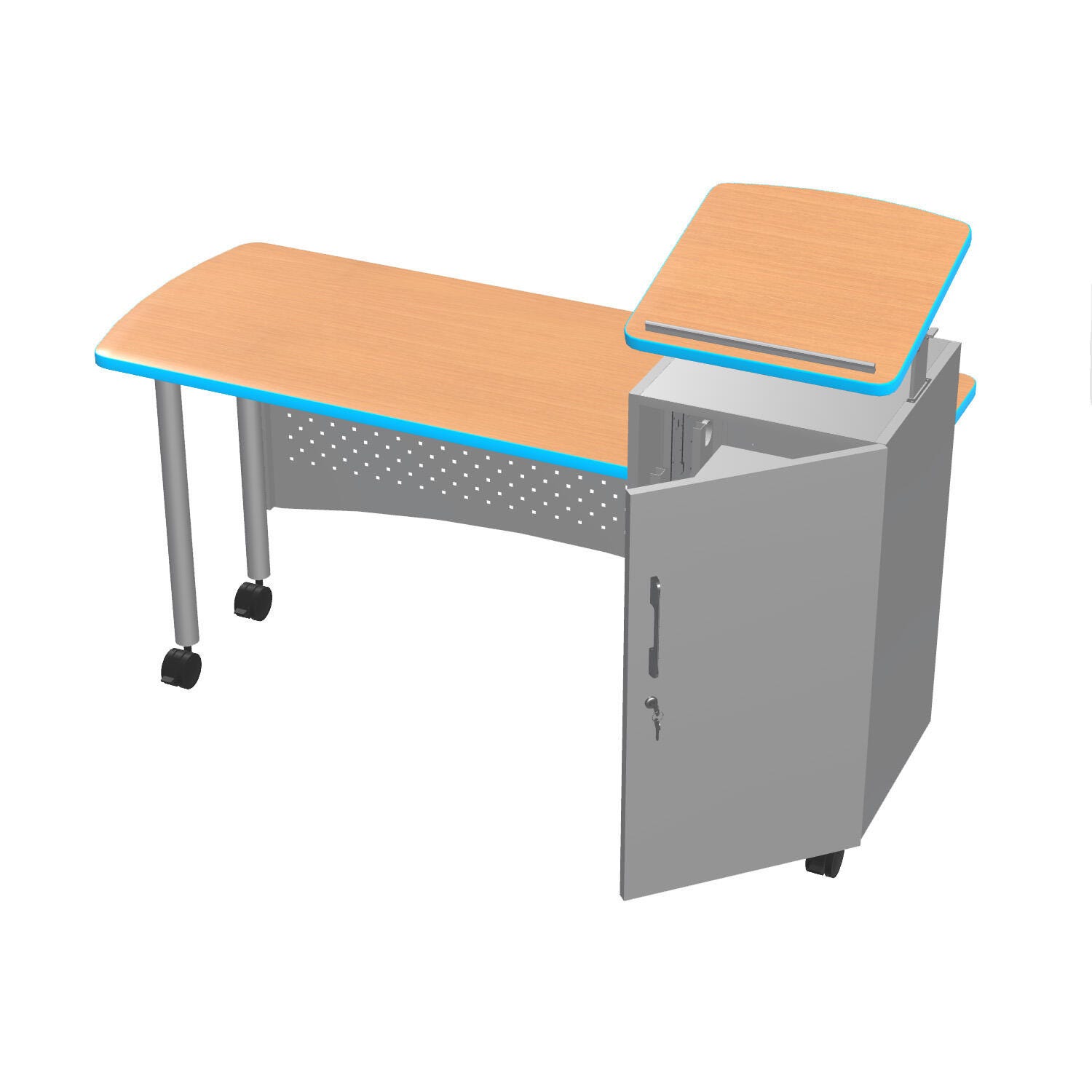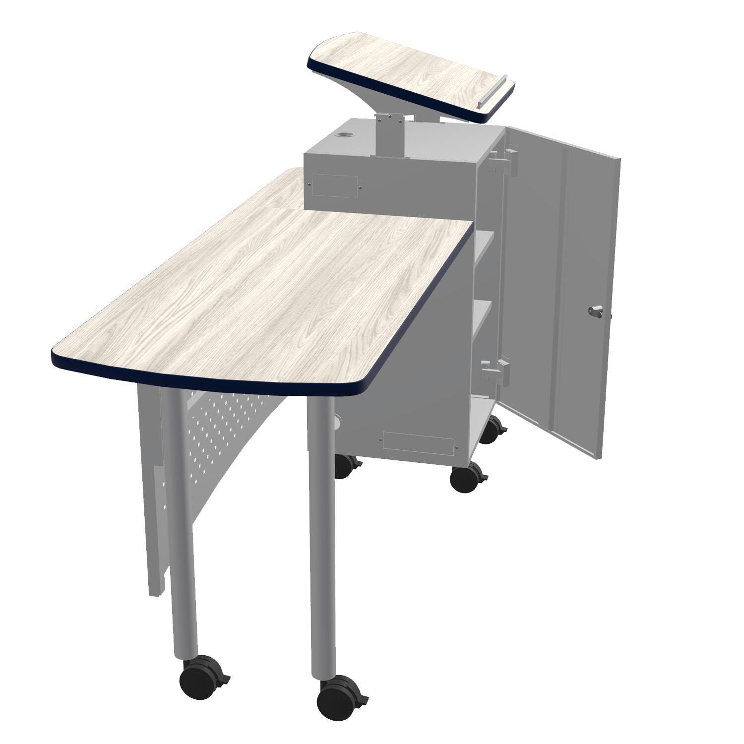 The Classroom Select® NeoClass® Mobile Podium Teacher's Desk is offered in multiple configurations and provides a functional "all in one" student-teacher meeting area and Teacher's presentation podium. Desks include perforated modesty panels for added style and structure and are made of strong durable steel throughout. The adjustable-height lectern with tilted top features a locking door with two adjustable interior shelves and a grommet for cord access. The lectern/podium measures 19-3/4 W x 20-3/4 D x 44.6 H inches. The podium top measures 20 x 20 inches and is height adjustable by 6 inches. The desk/podium has standard heavy-duty casters.Features