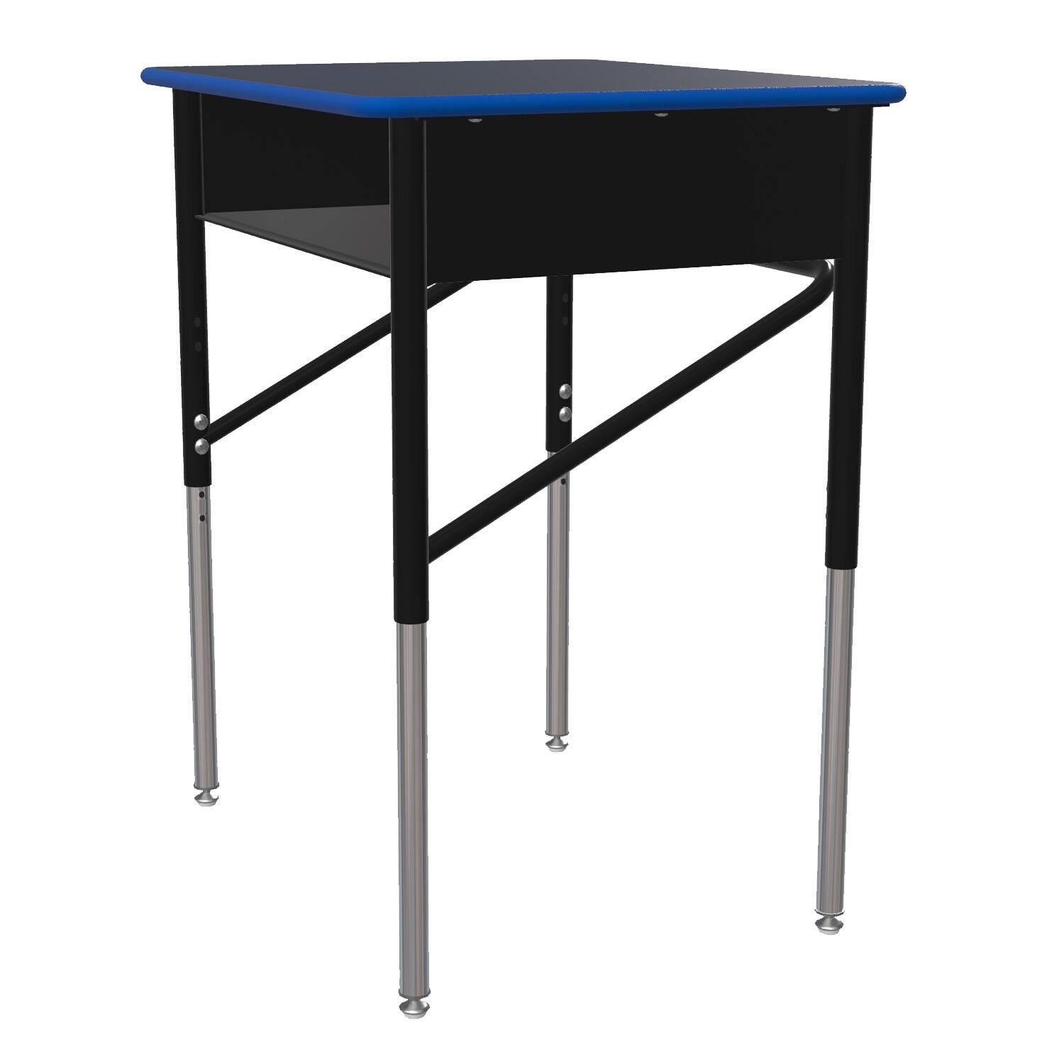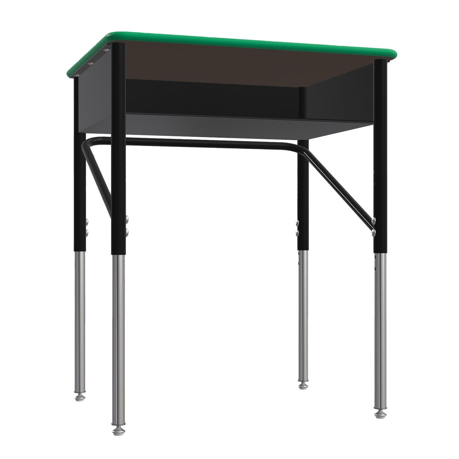 This traditional classroom desk features a large 20 x 24-inch laminate top with convenient storage for books, pencils, and other supplies. Desktop is available in 5/8-inch MDF laminate with a urethane painted edge. The desk is height adjustable from 22-1/2 to 33-1/2 inches. Leg Inserts are full nickel chrome and leg uppers have a black powdercoat finish.