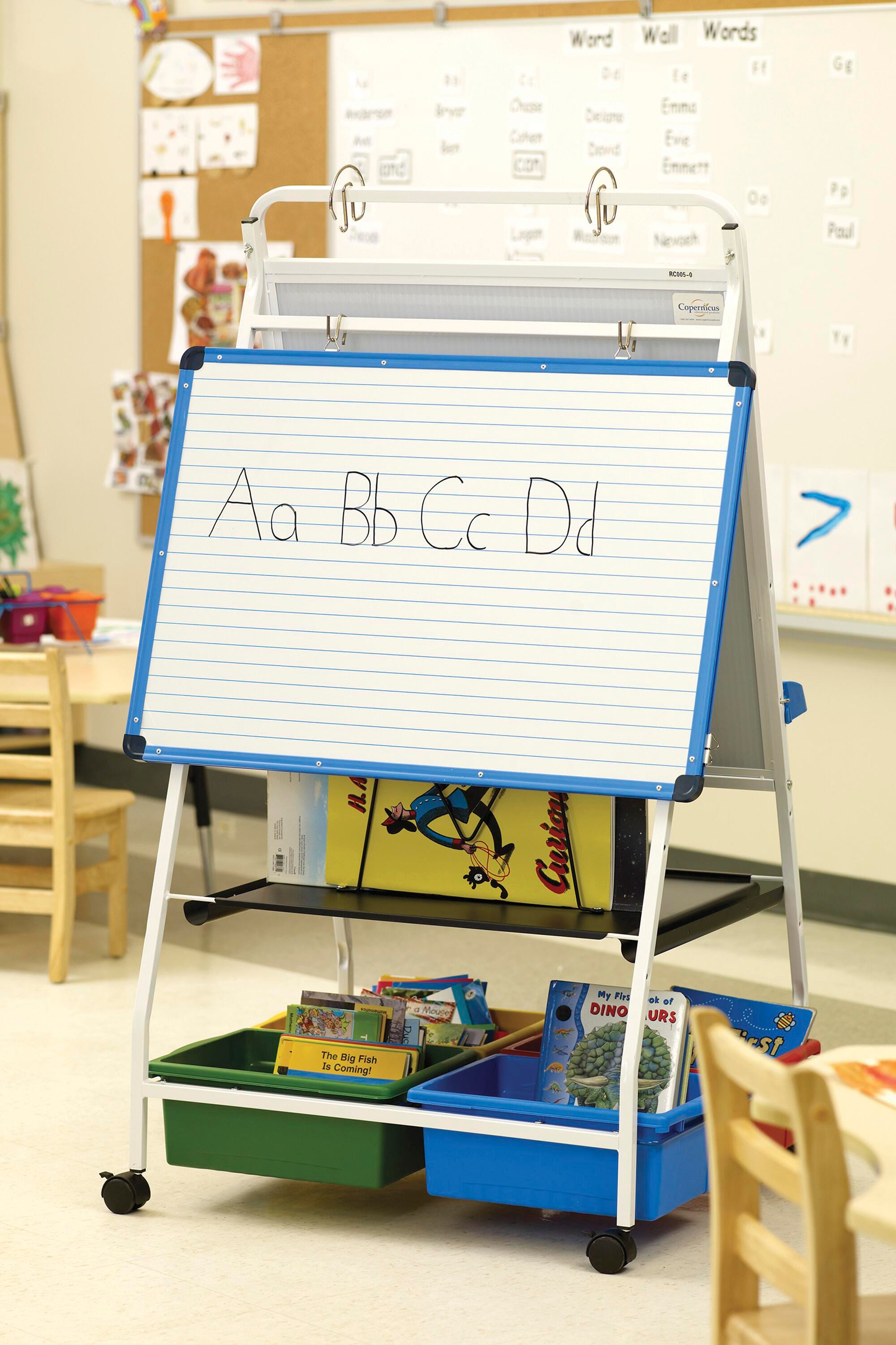 The award winning Royal Reading/Writing Center is an essential teaching tool for all primary classrooms. Front magnetic dry-erase surface measures 24 W x 34 H inches. The rear double-sided dry-erase board measures 24 W x 32 H inches and is removable and lined on one side. Frame measures 33 W x 27 D x 57 H inches. Tubs measure 12-1/2 W x 15-3/4 D x 6 H inches. Lifetime frame and tub warranty.
