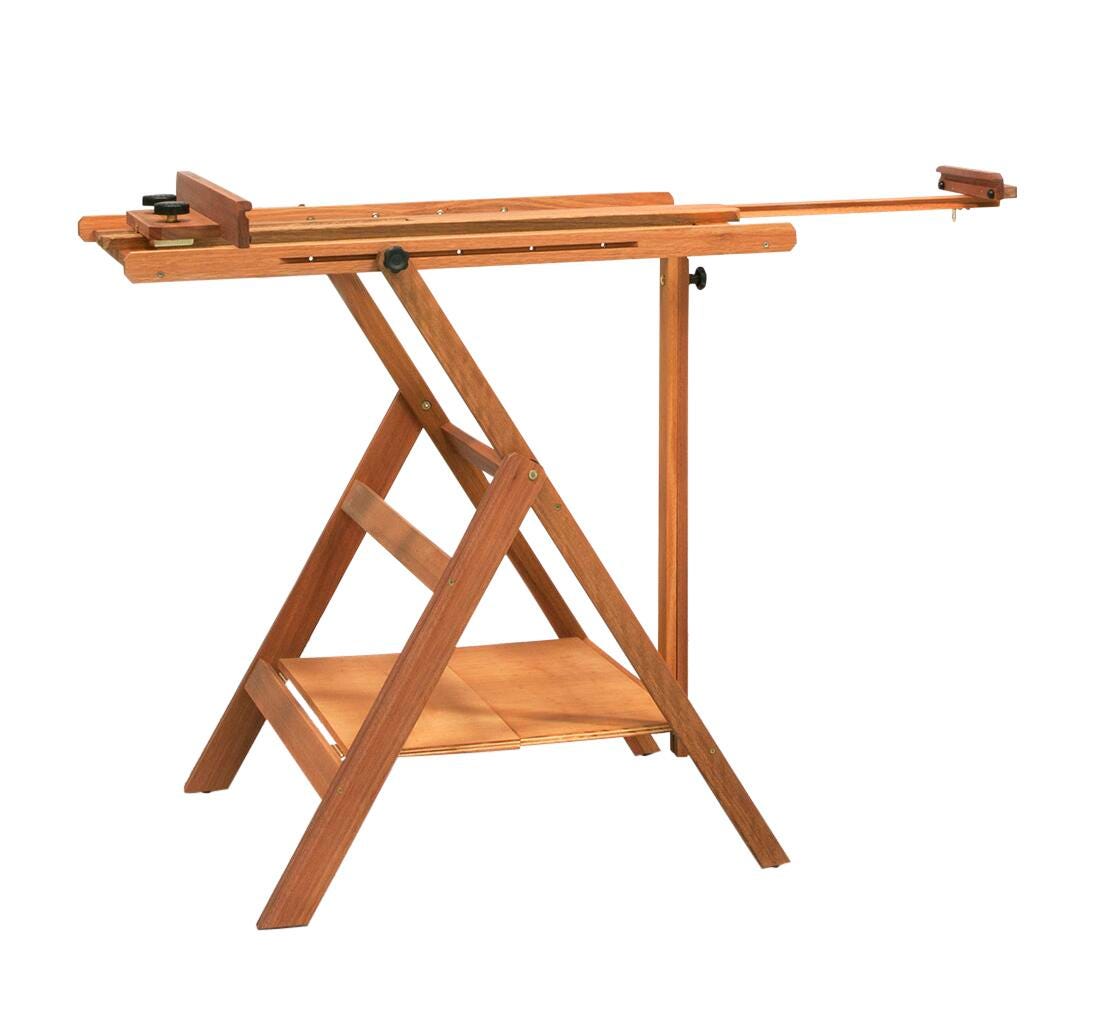 Jack Richeson Lyptus Lobo Easel crafted from hand-rubbed, oil-finished, solid oak for beauty and longevity is a compact, versatile and an affordable easel. A multitude of angle settings accommodate the watercolor, pastel and oil painter. Easel with 24 in x 27 in base holds canvases up to 55 in and has height that adjusts from 65 in - 95 in. Easel can be completely folded flat for convenient storage. The horizontal table height can reach 36 inches. Handy features include a supply shelf underneath the frame, adjustable painting tray, retractable mast and bottom tray.Features