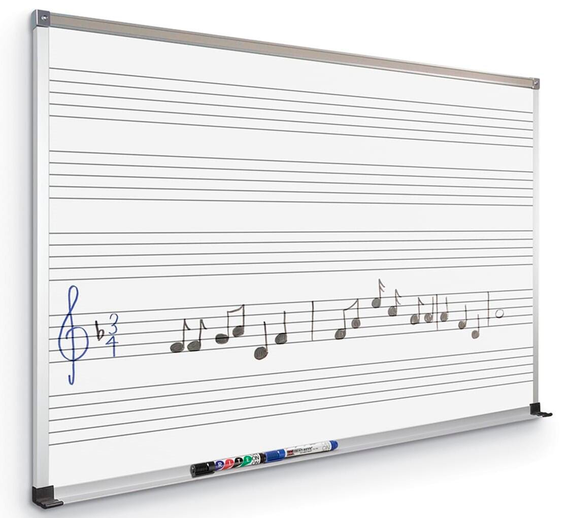 The Music Line Board makes your music room, band hall, orchestra space, or choir room more efficient, functional, and usable. Eliminate the time-consuming repetition of drawing and redrawing musical staffs. Quickly and easily draw out musical notes and symbols. Lines in each staff are 1 inch apart and are permanently laminated to a lightweight substrate for stability and durability. Low gloss porcelain dry-erase whiteboard provides superior writability and erasability with no ghosting. Reduced surface light distortion enhances visibility to provide optimum eye comfort. Anodized aluminum trim has a 7/8 inch profile with hairline-mitered corners. Boards include a full-length tackable map rail with a tackable insert, and a full-length accessory tray with rubber Dura-Safe® end caps to eliminate sharp edges. 50-Year Warranty.Features