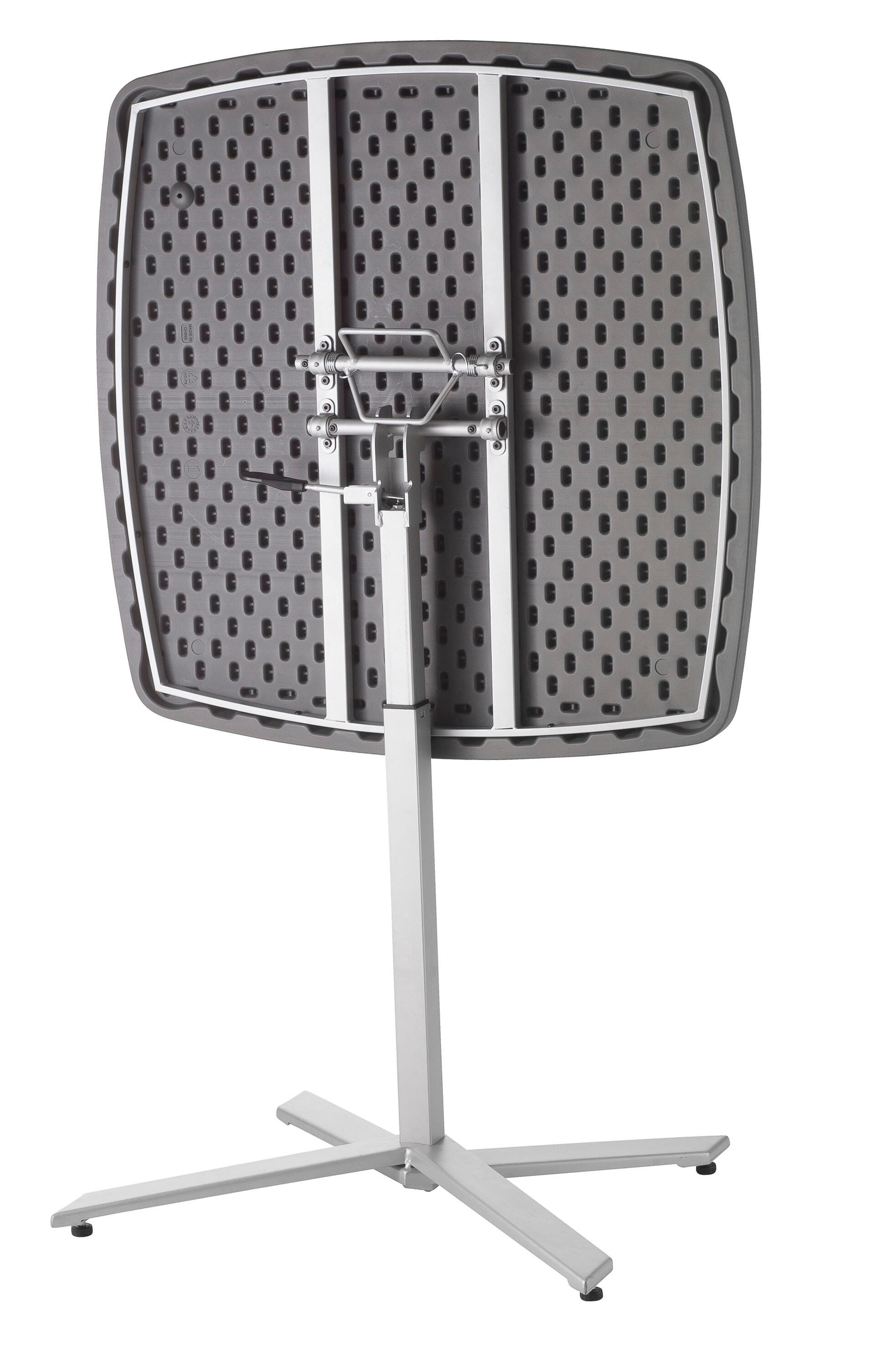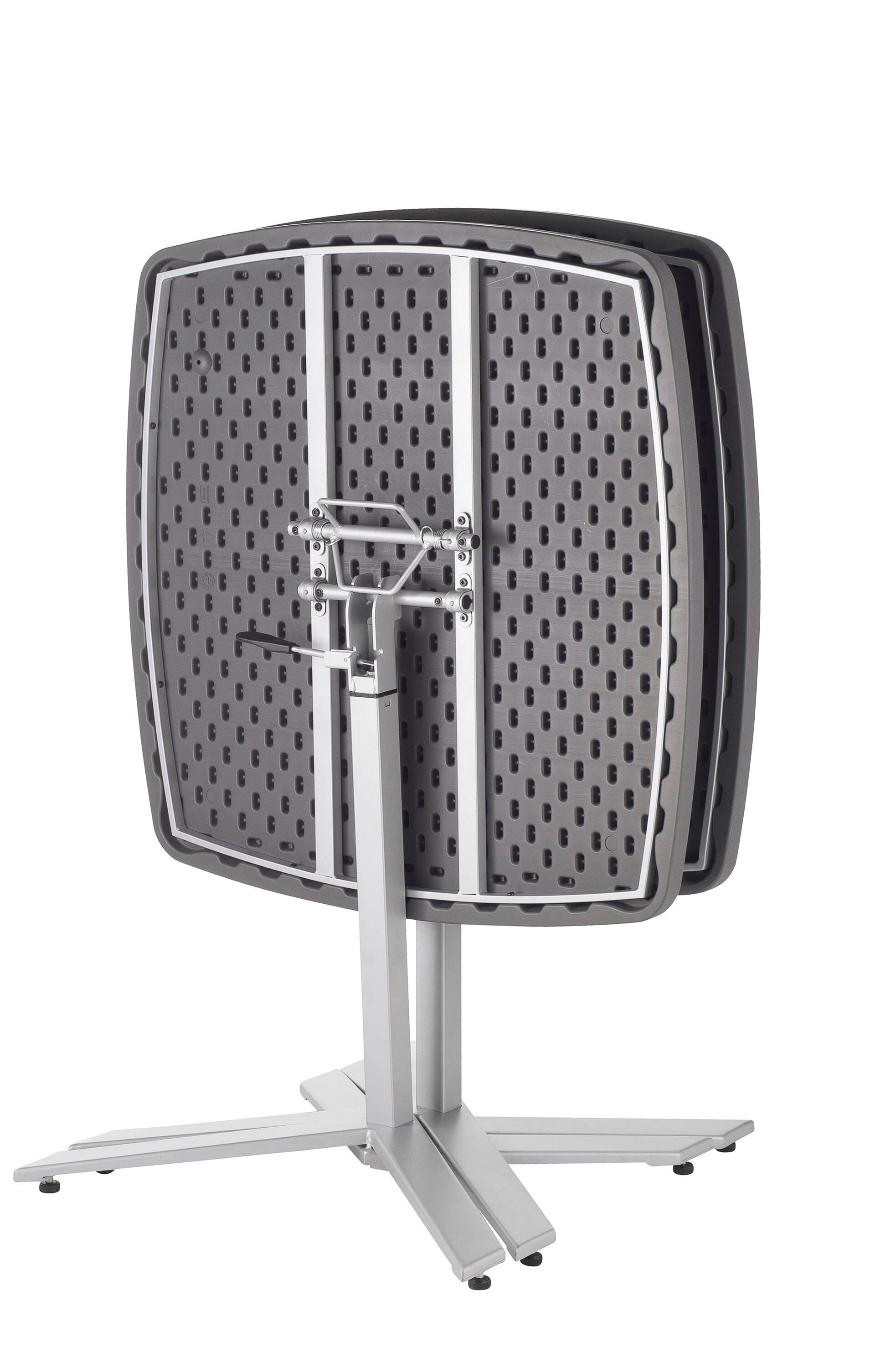 Lightweight table made from blow molded plastic, charcoal color, adjustable height with pneumatic lever from 30" -42" height, flip & nest together for easy storage, 700 lb. weight capacity. Matching stool is also available, item# 1584447. 36 x36 inches.