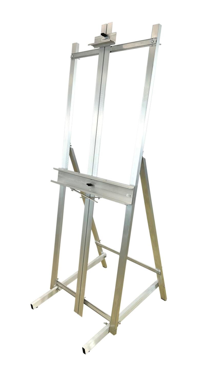 School Specialty Professional H-Frame Easel is a professional-quality, aluminum easel that renders unparalleled strength and yet is remarkably light-weight. Extra sturdy easel featuring a 24 in wide utility tray with palette holder supports canvases up to a height of 60 in. 15 lb Easel with center section that can be raised and lowered can be folded flat for space-saving storage.
