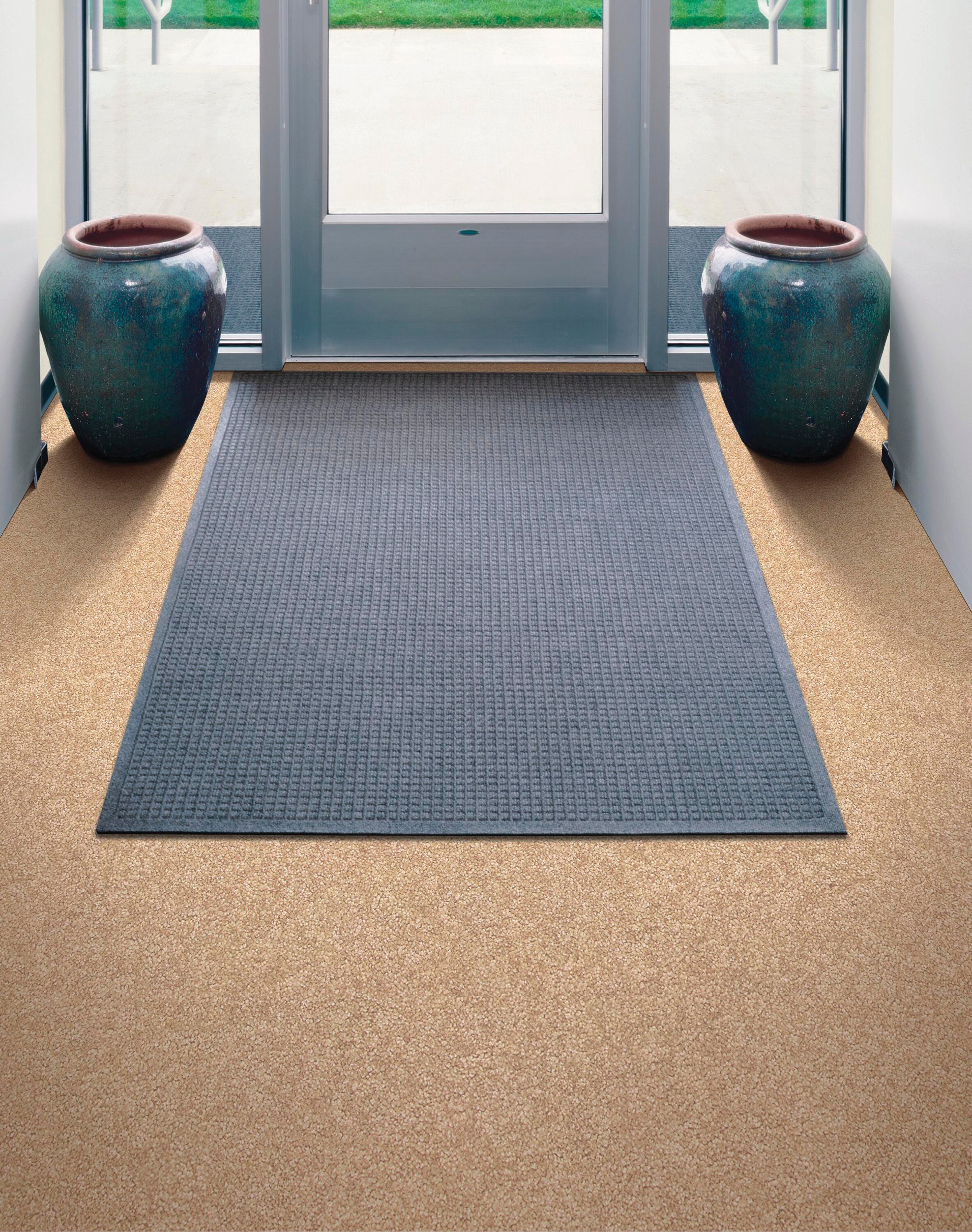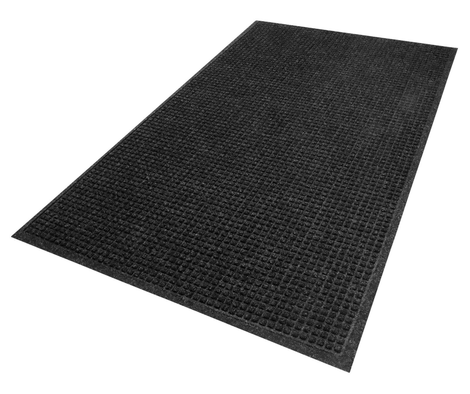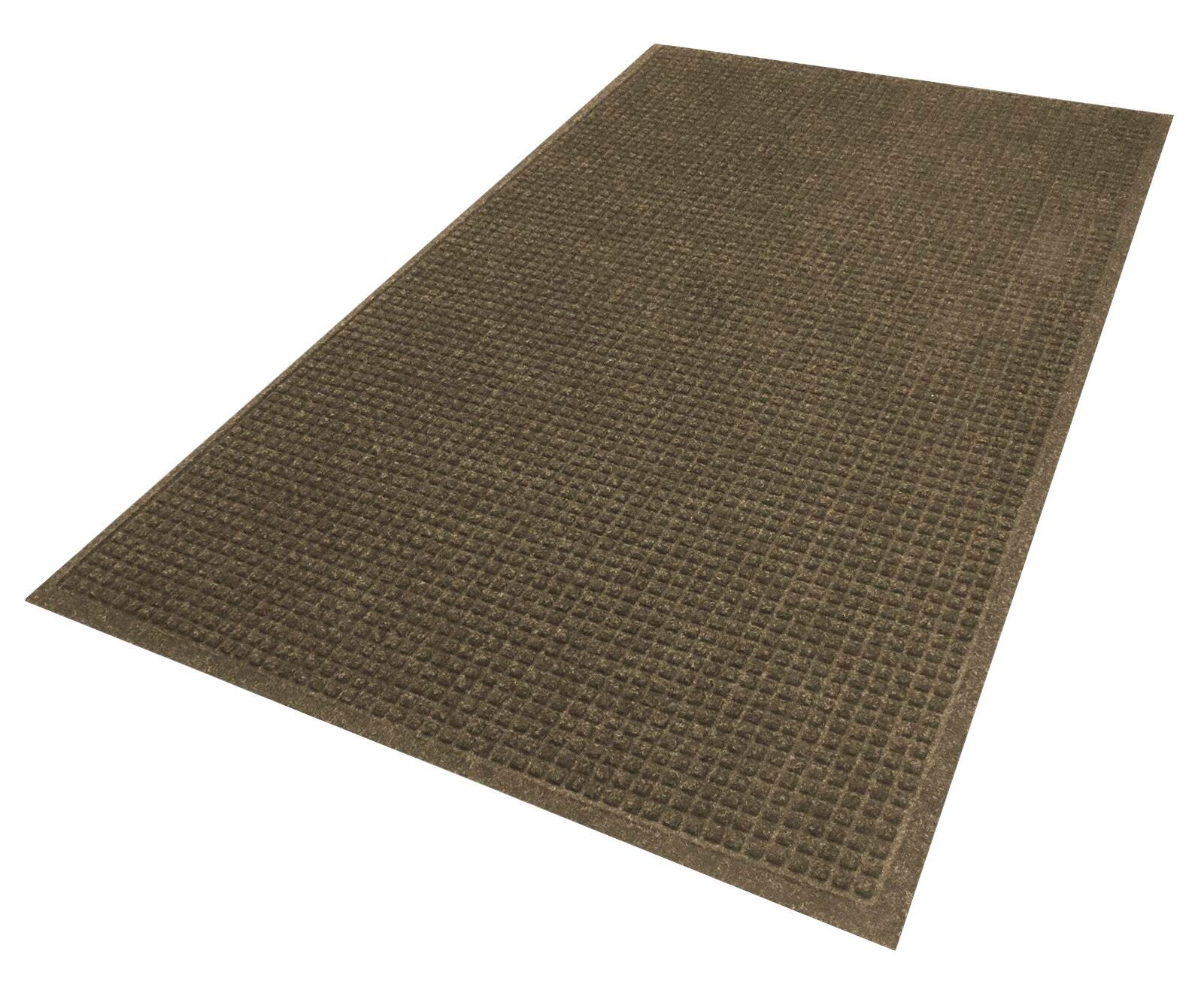 Description WaterHog mats are durable, stain-resistant mats with a unique bi-level design that traps dirt and moisture, keeping your floors clean, dry, and safe. Please note, mat sizes are approximate as rubber shrinks and expands in conjunction with temperature and time. Tolerable manufacturing size variance is 3-5%. WaterHog mats can hold up to 1.5 gallons of water per square yard.Features Bi-level surface effectively scrapes dirt and moisture from shoes, trapping it beneath shoe level to prevent tracking; water dam border holds moisture keeping it off your floors Reinforced rubber nubs prevent pile from crushing and extend the performance life of the mat; edges will not crack or curl Solution-dyed fabric is resistant to staining, dries quickly, and will not fade or rot RBeveled edges provide a safe transition from floor to mat Surface contains PET, an eco-friendly polyester made from 97% recycled plastic; SBR rubber backing contains 20% post-consumer recycled rubber from car tires